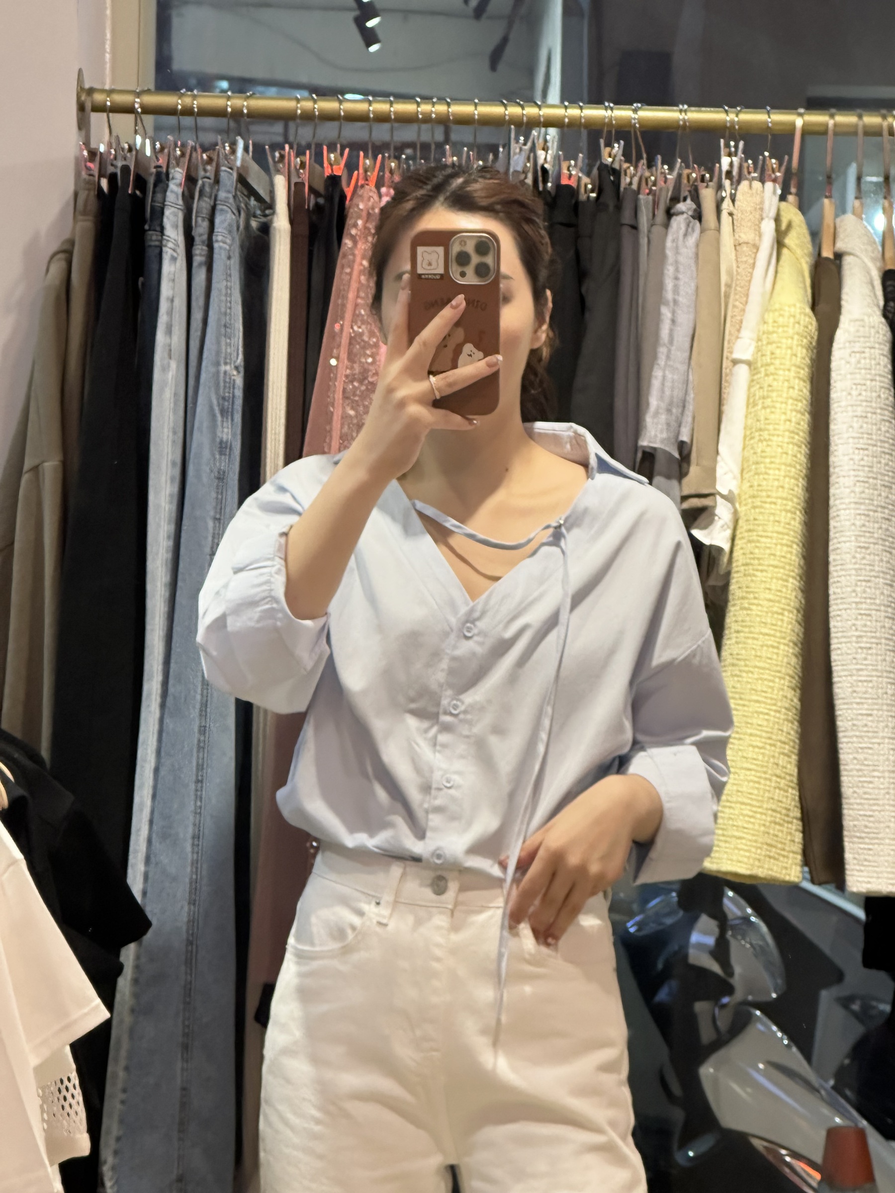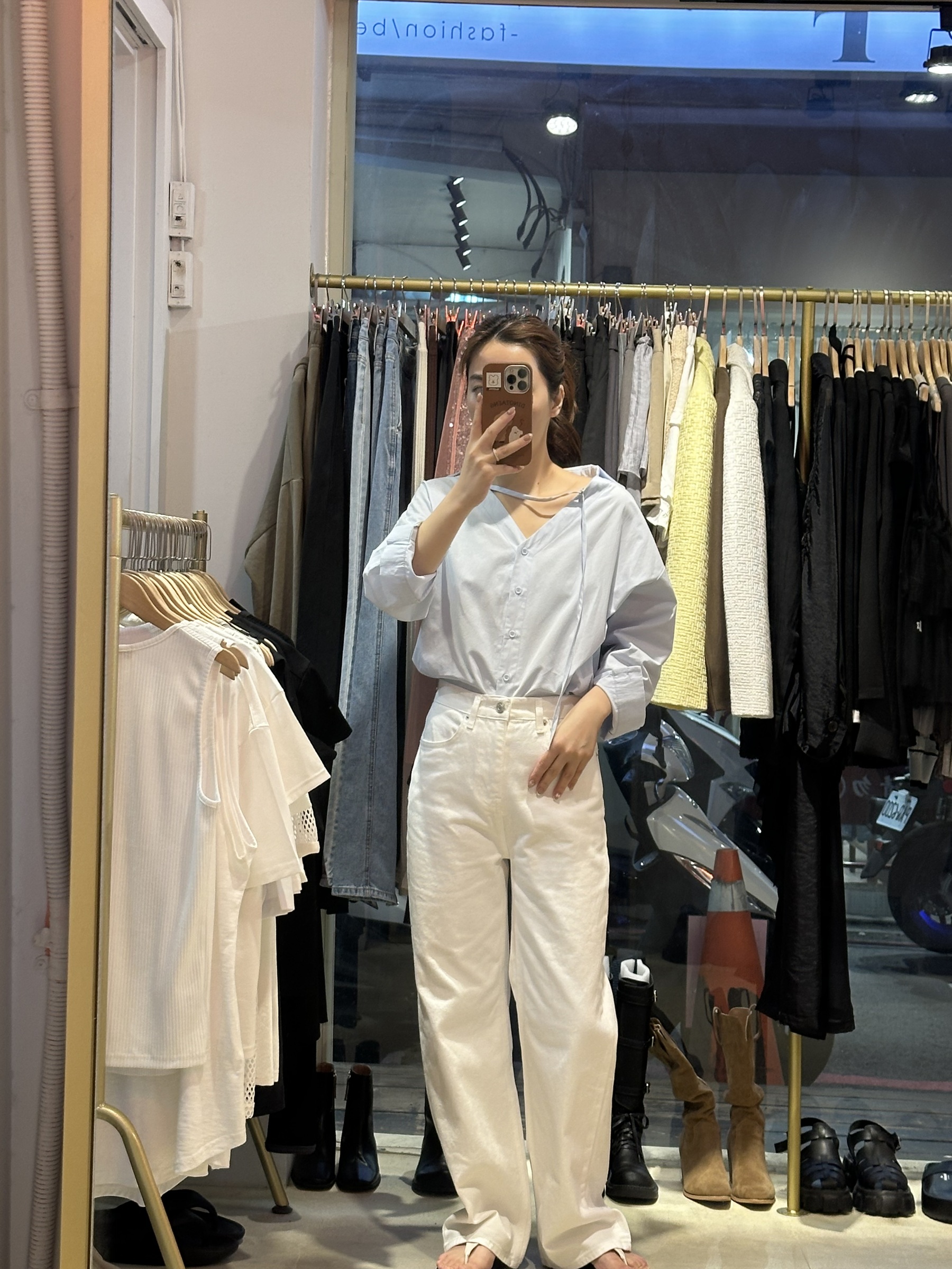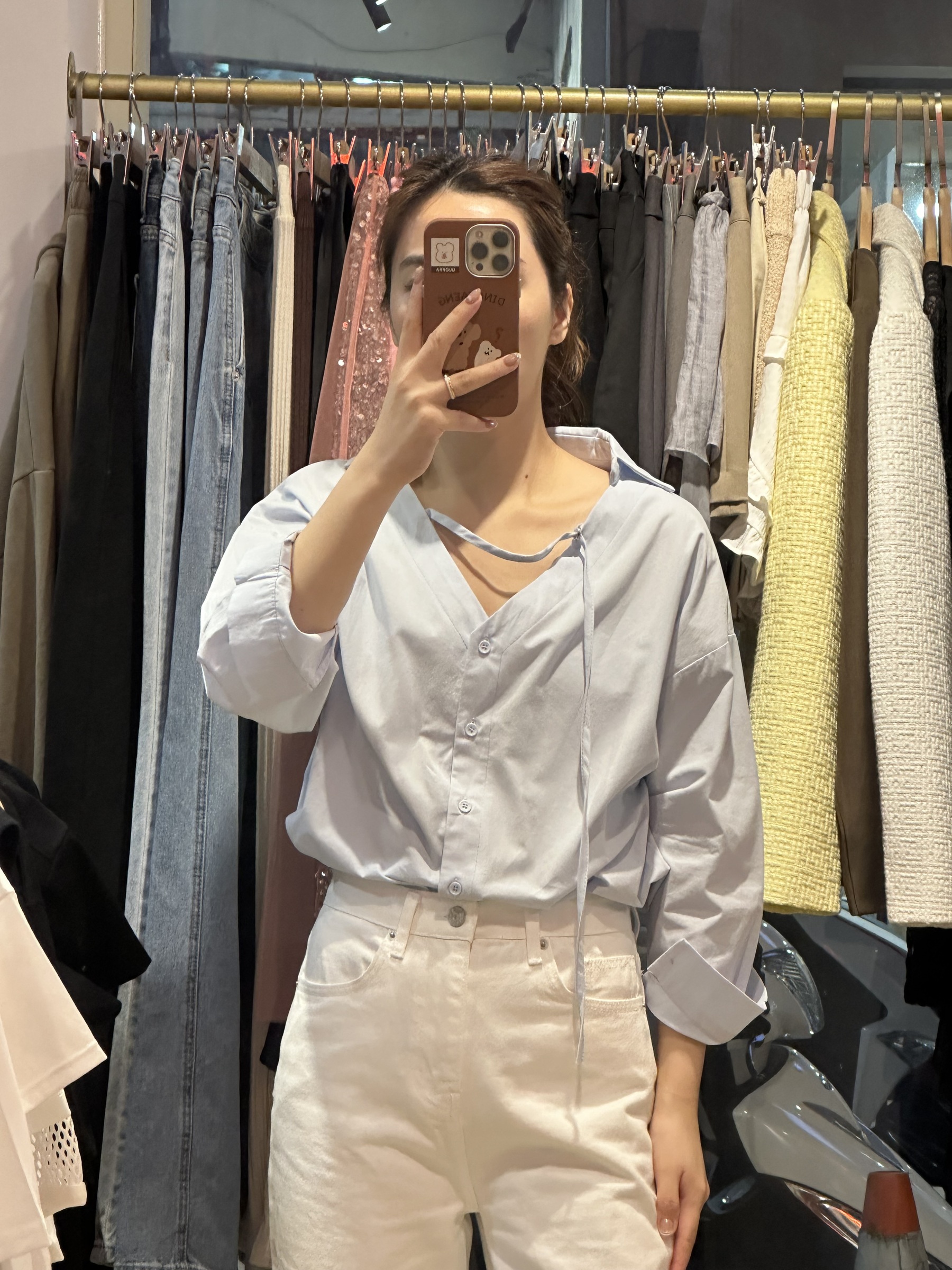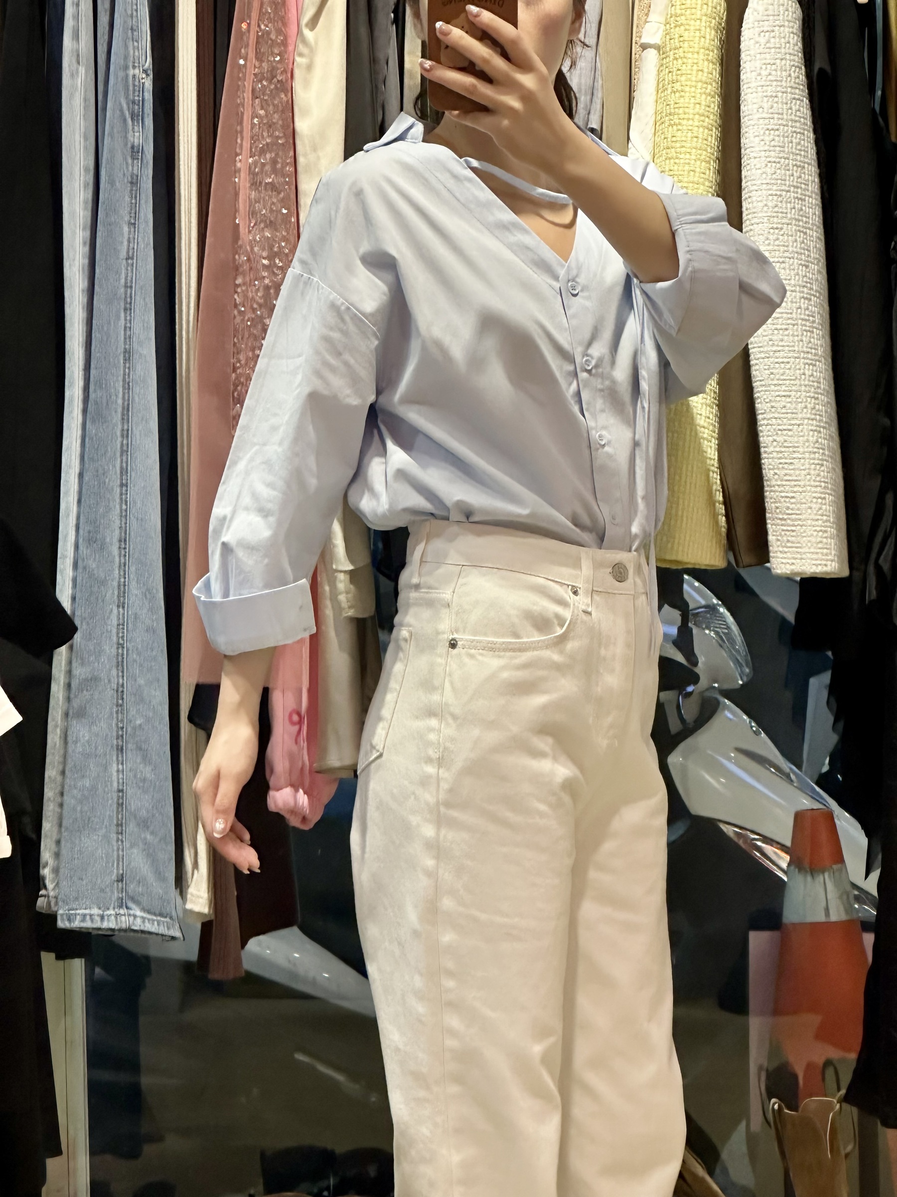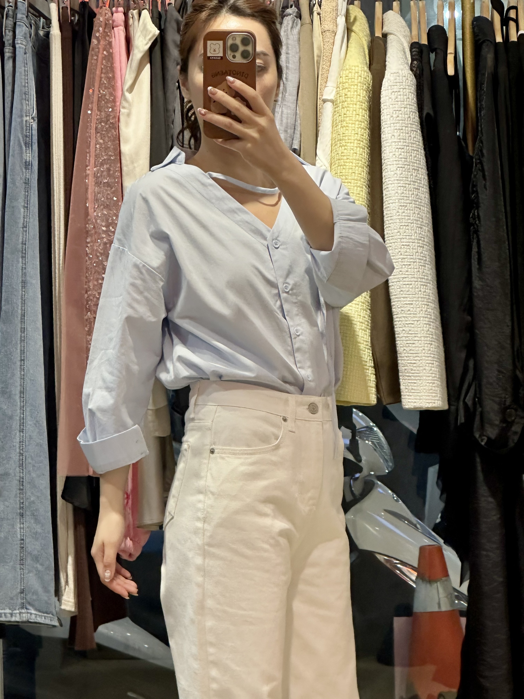 胸前的V不會太深,將襯衫往後一點穿,背面會呈現個漂亮的弧度