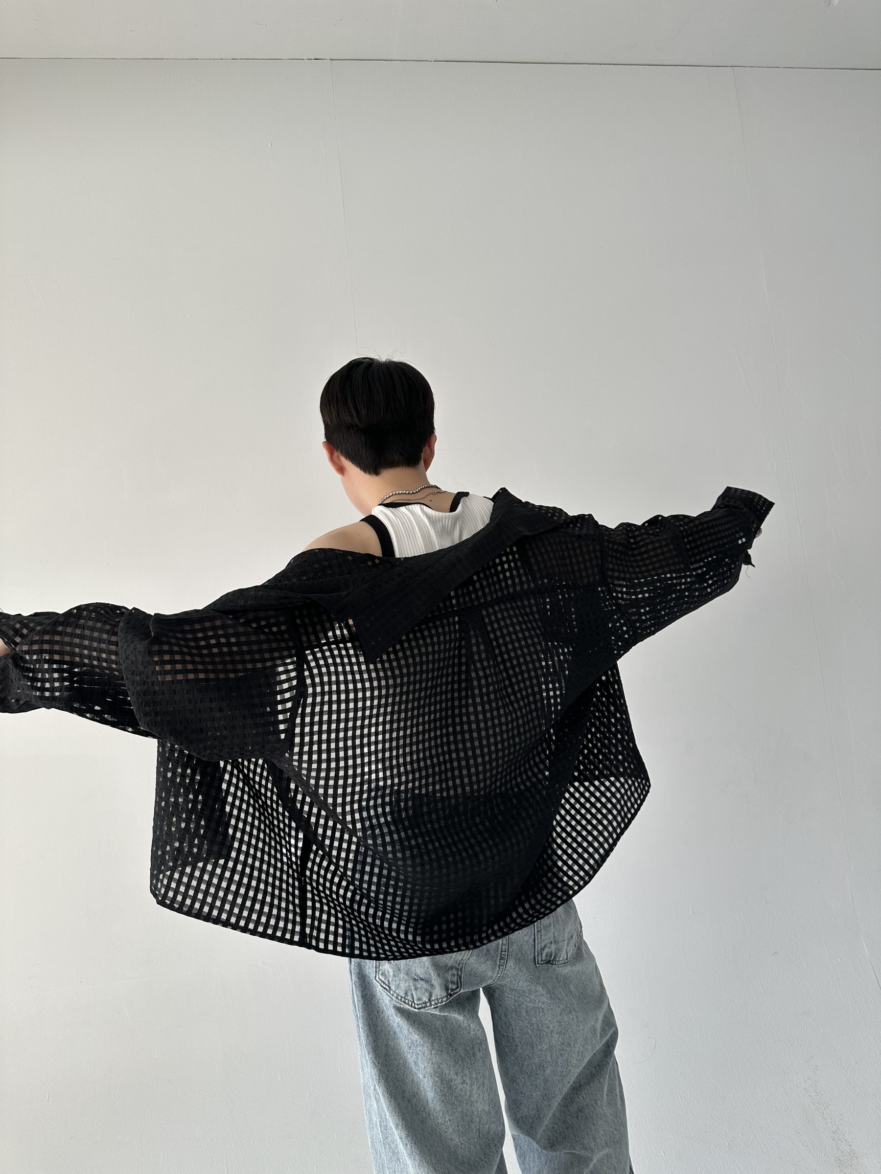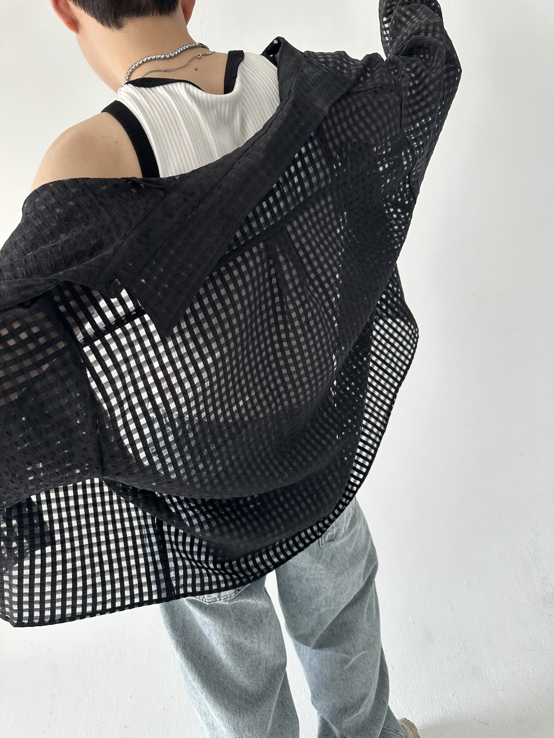 方格透視短版襯衫