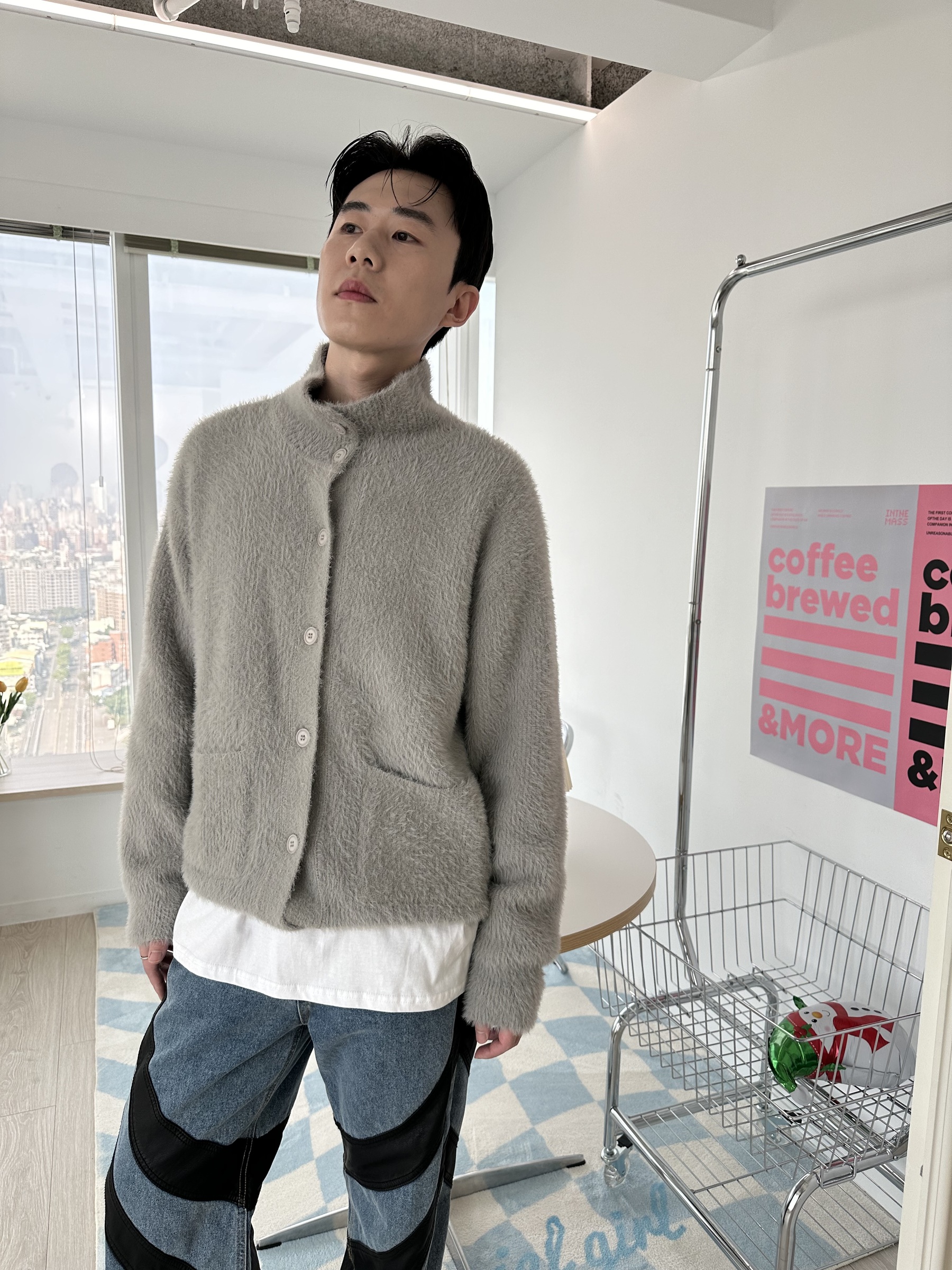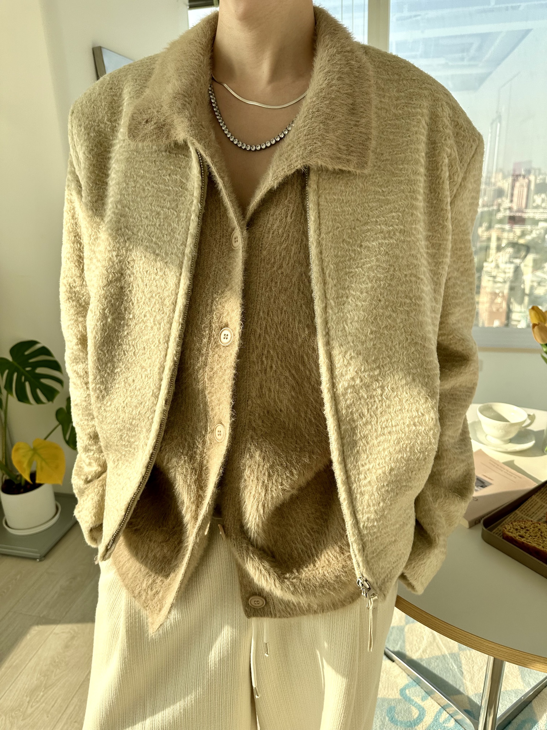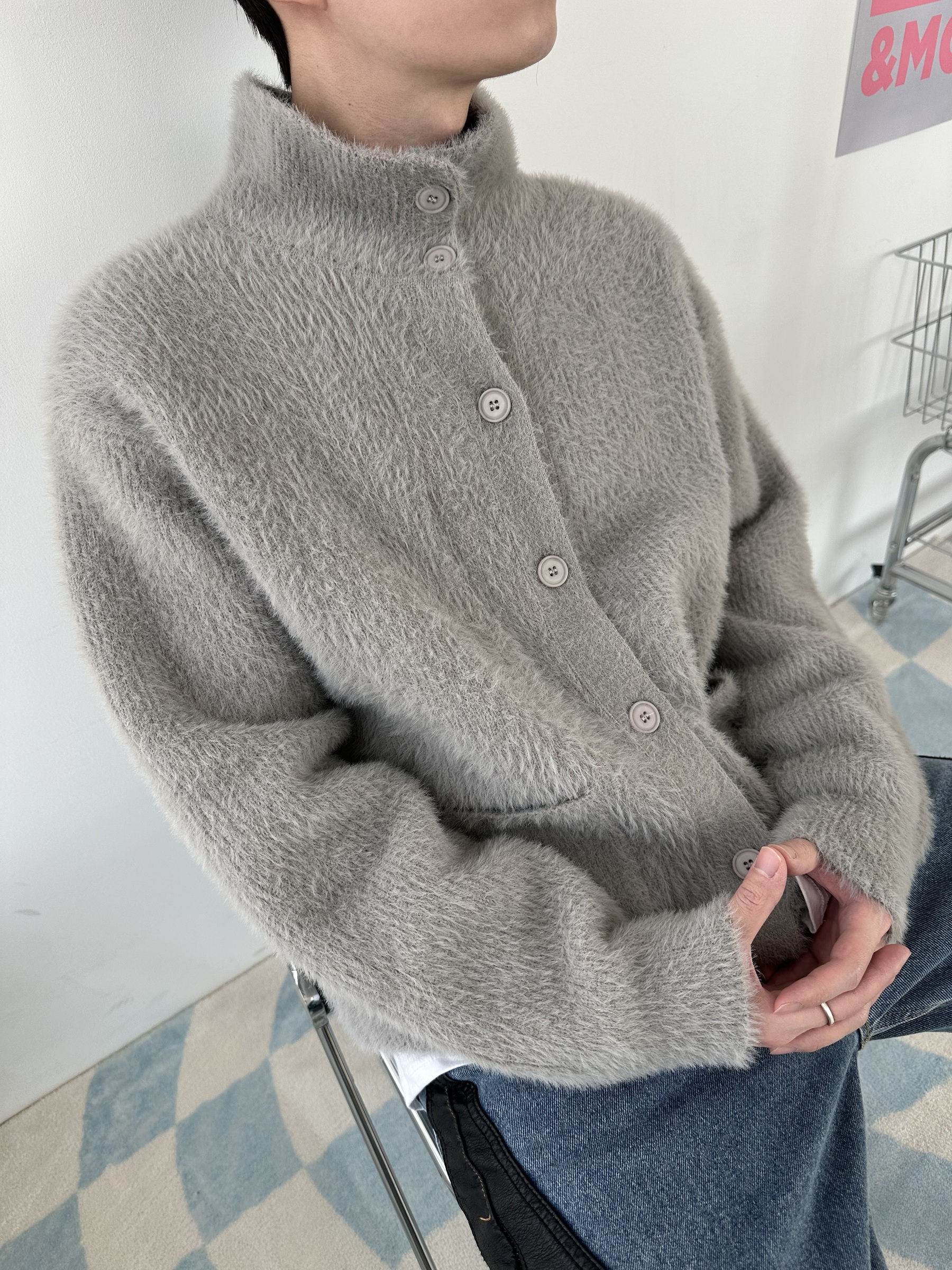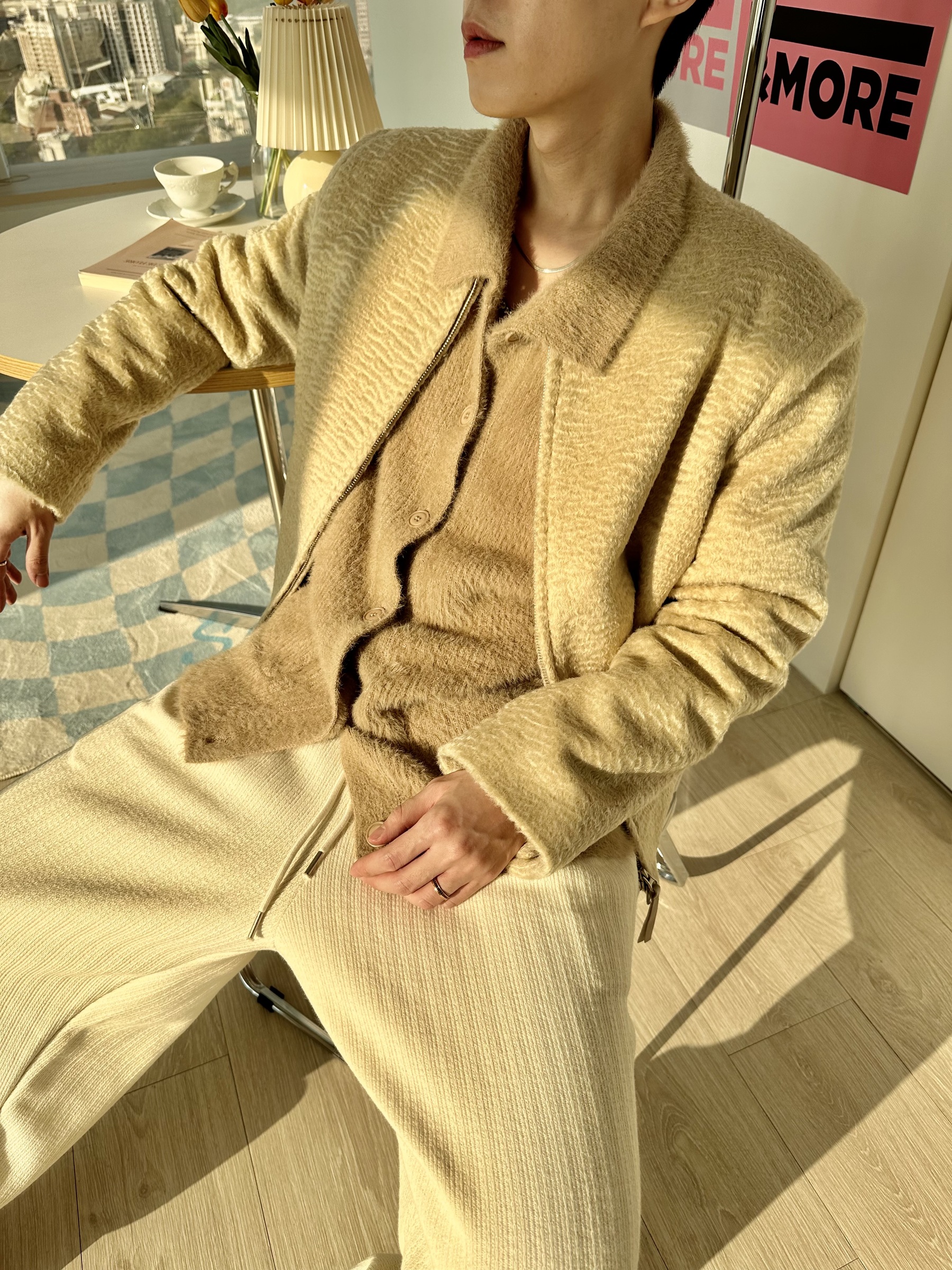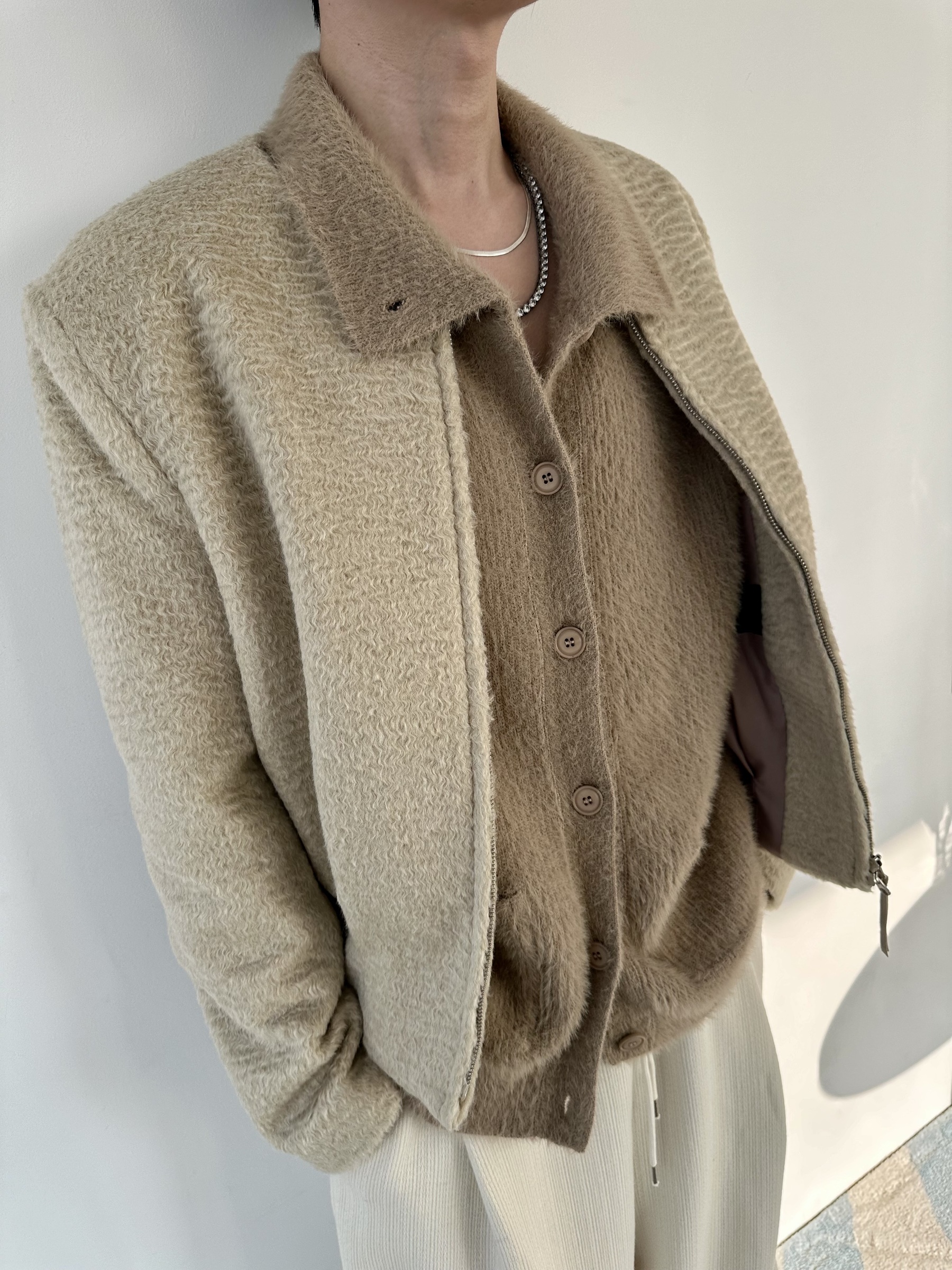 馬海毛布料,不會太厚,台灣日常當個小外套搭配非常好用