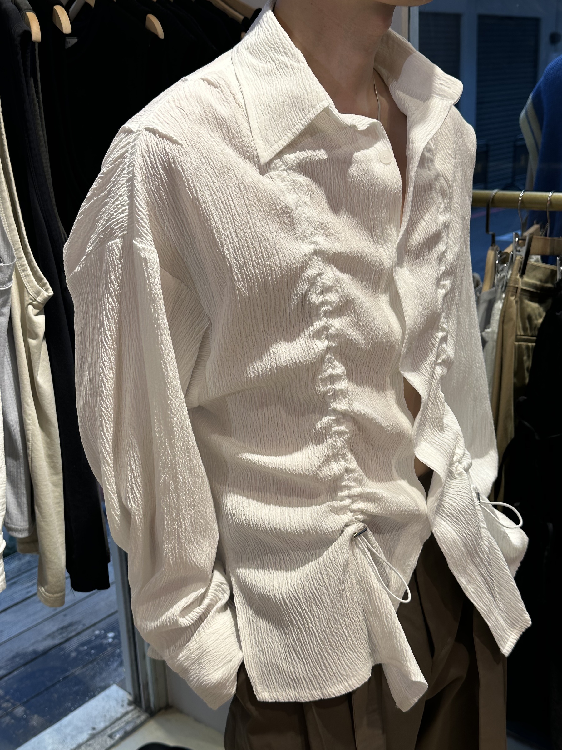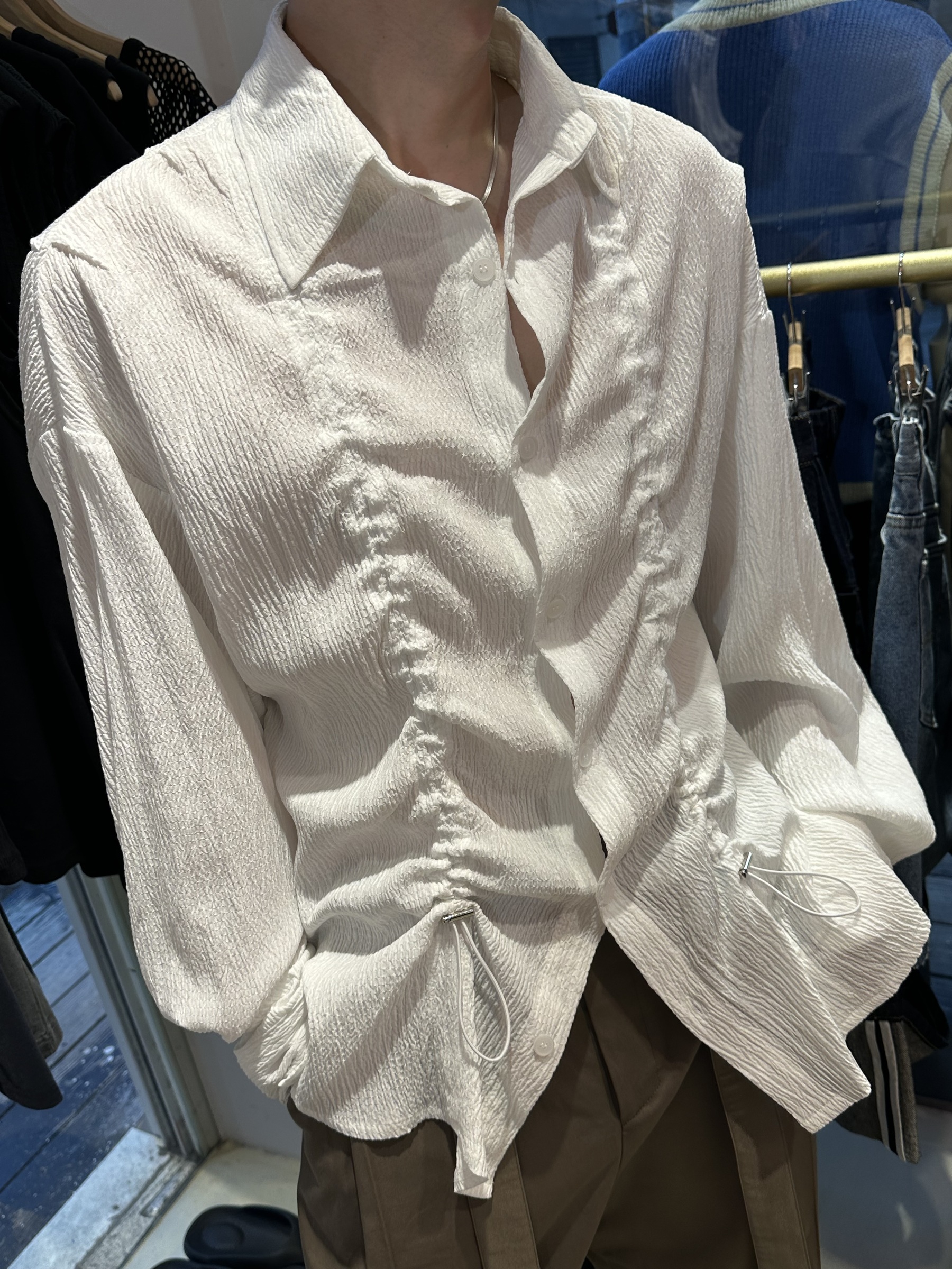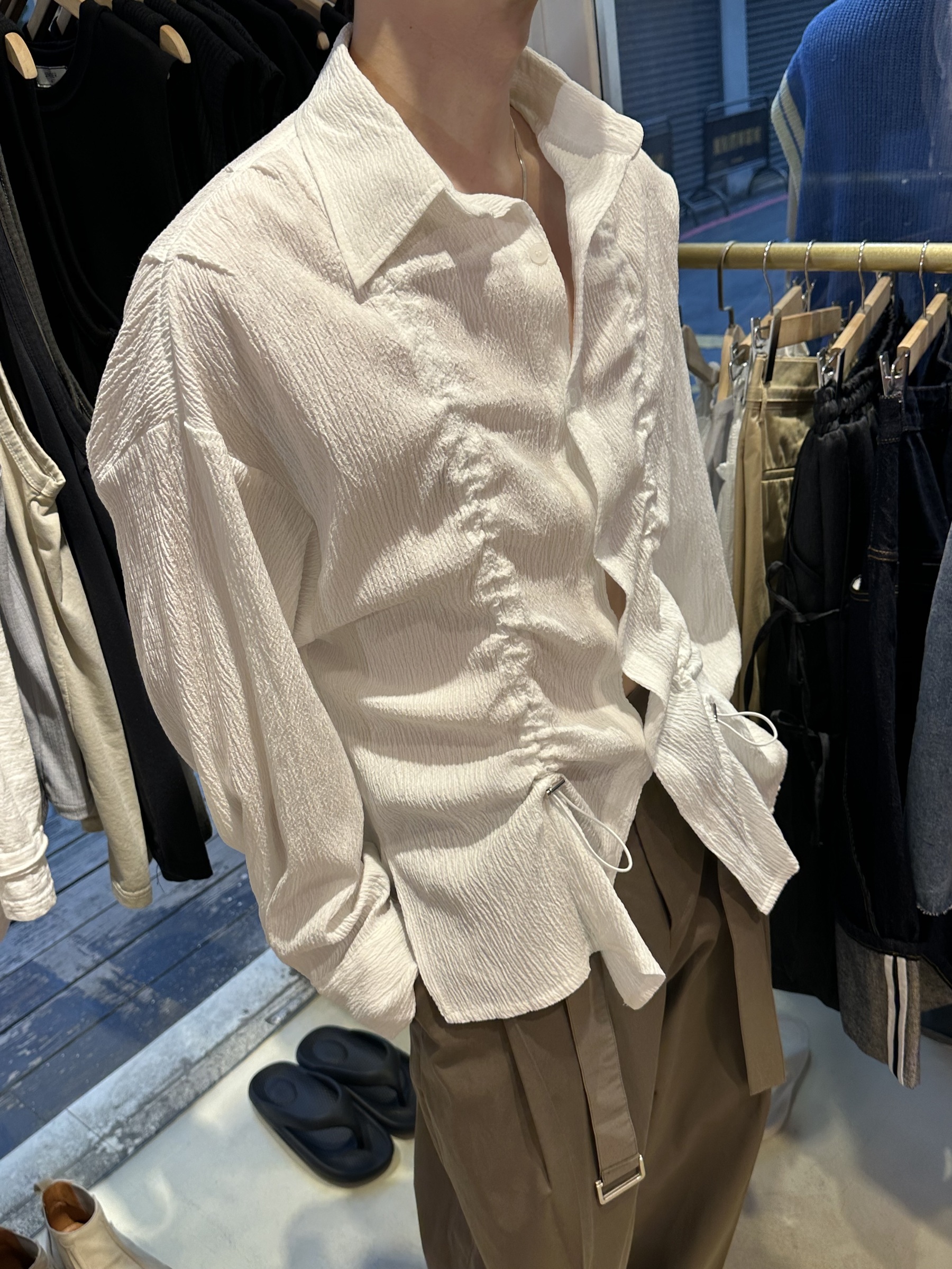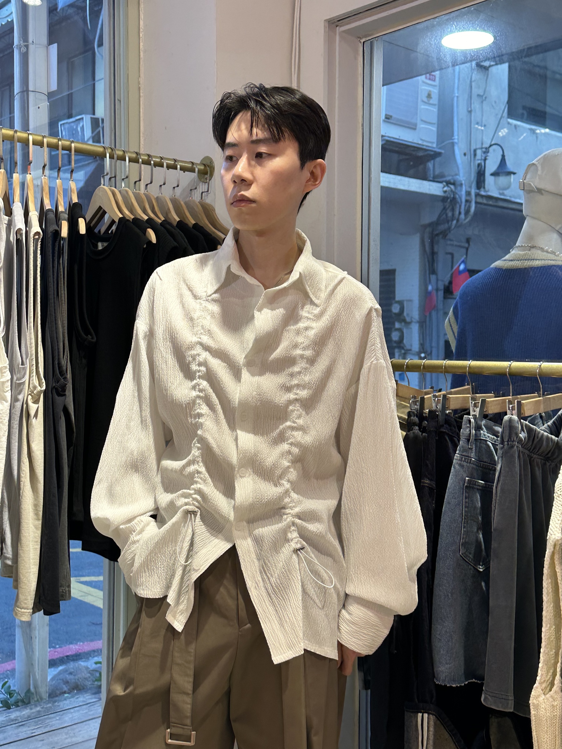 胸前有做兩條抽繩的設計,可以使襯衫蜷縮起來