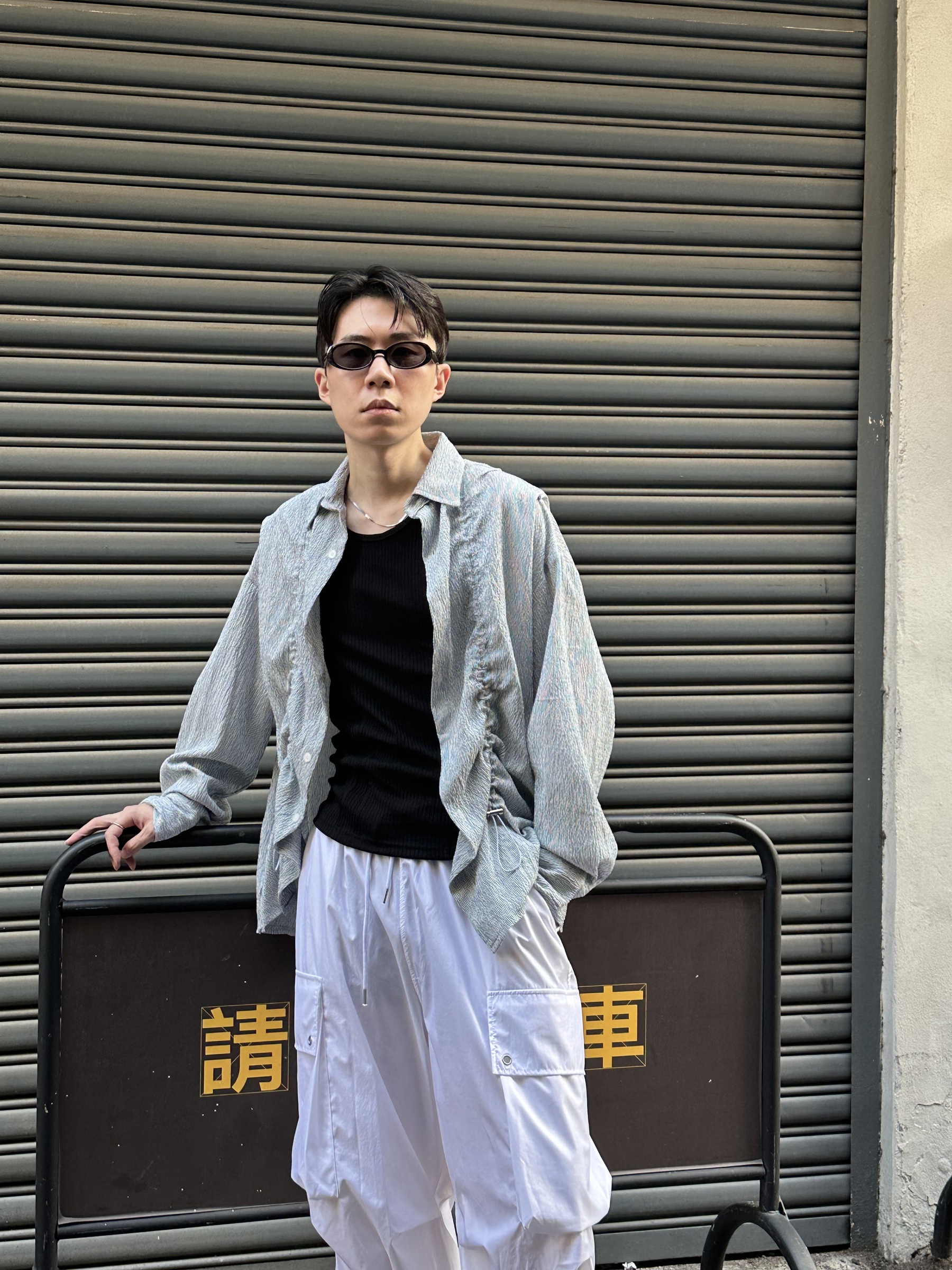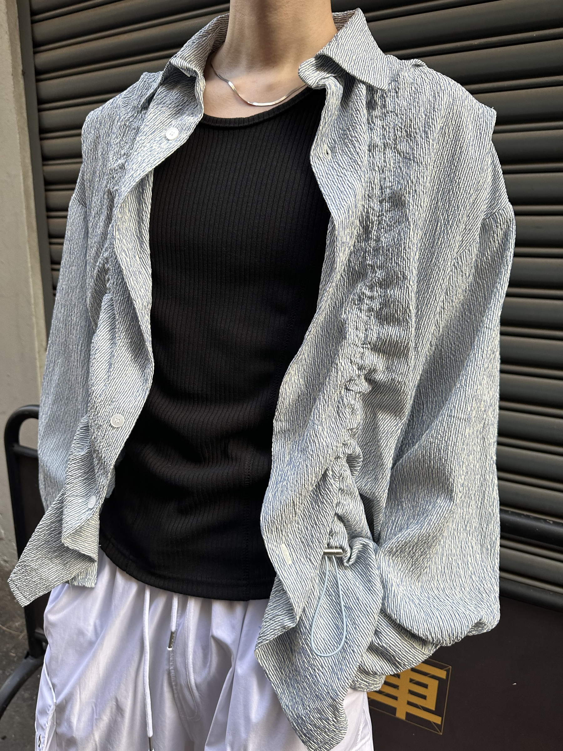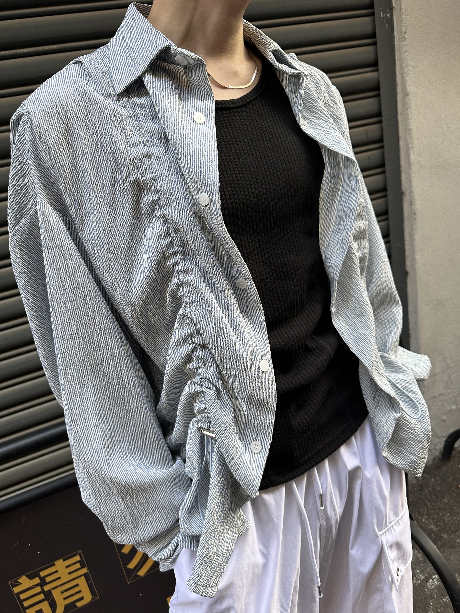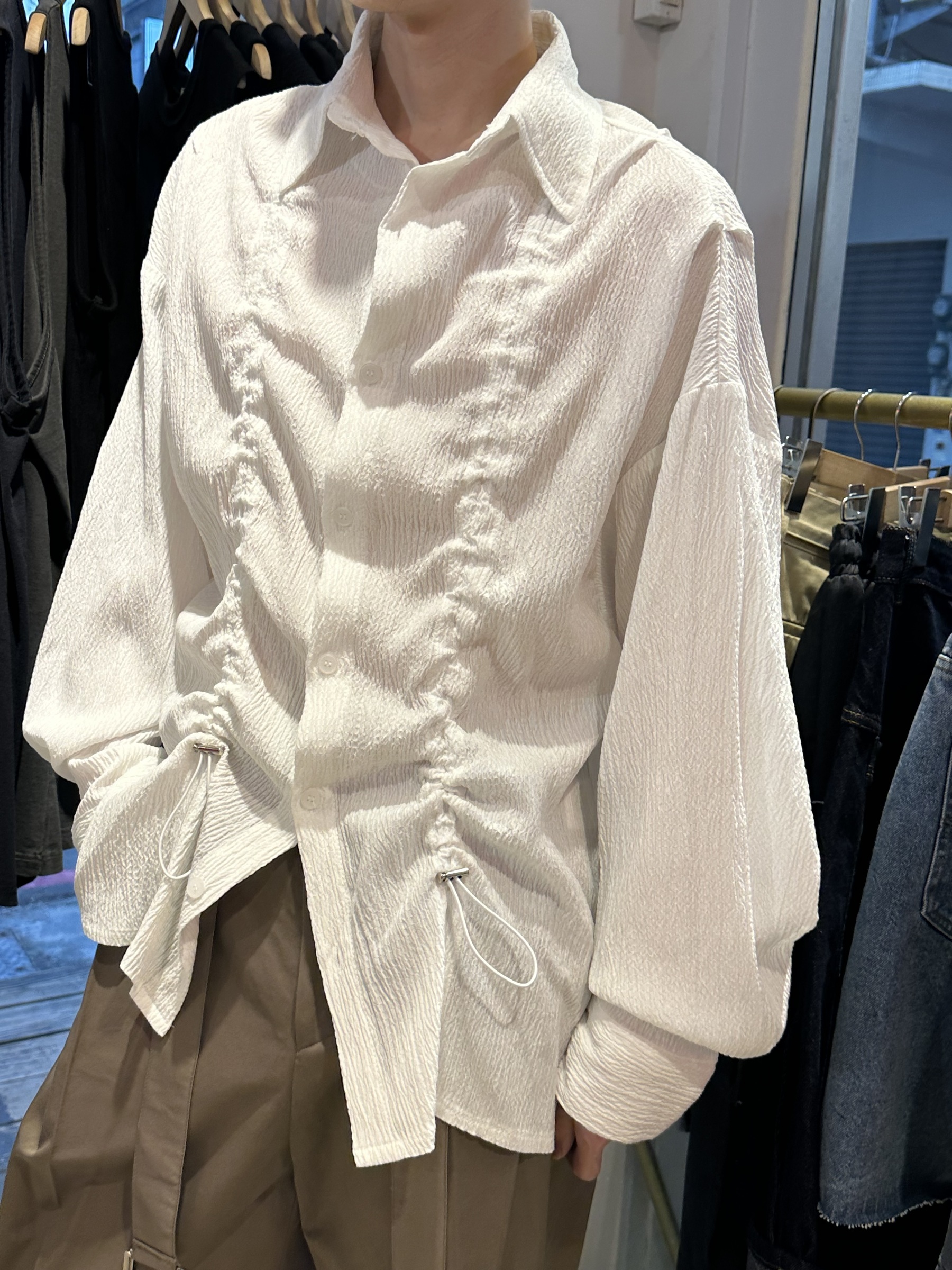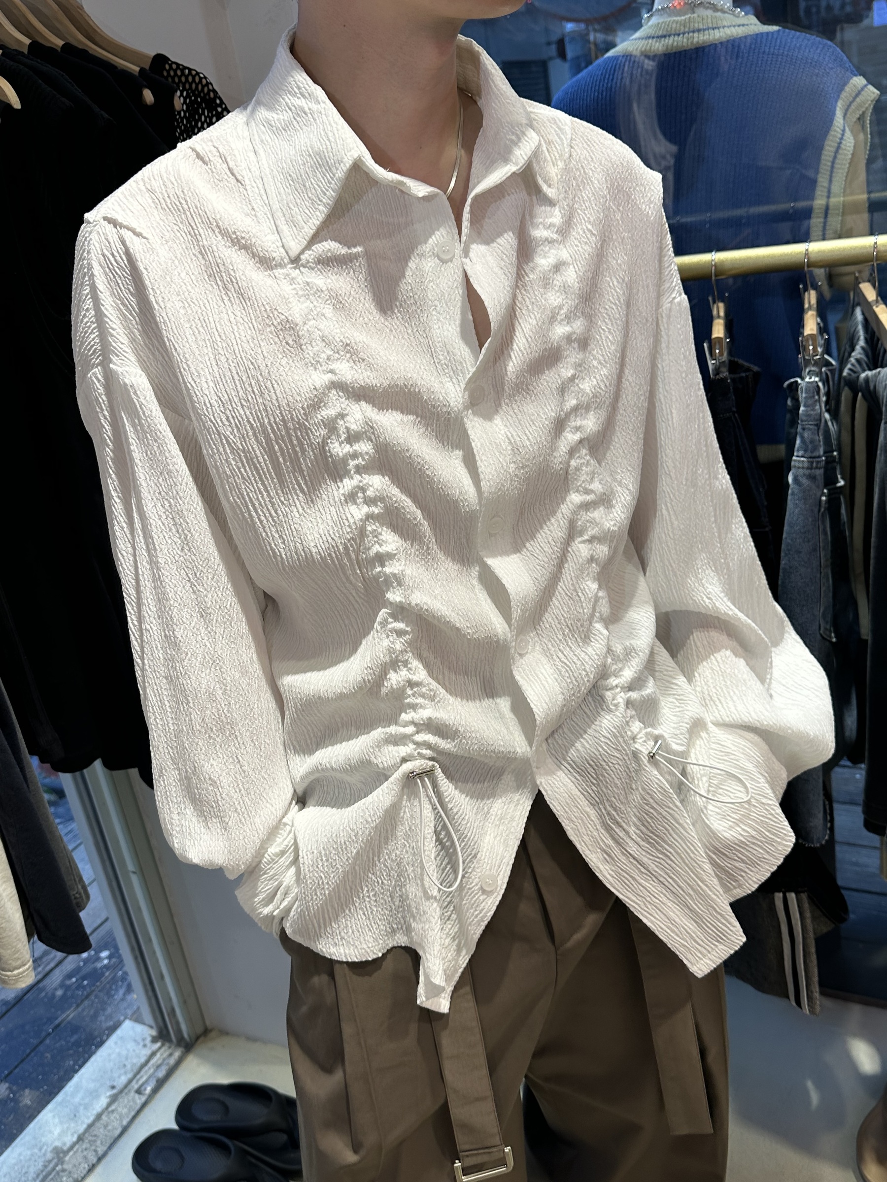 胸前有做兩條抽繩的設計,可以使襯衫蜷縮起來
