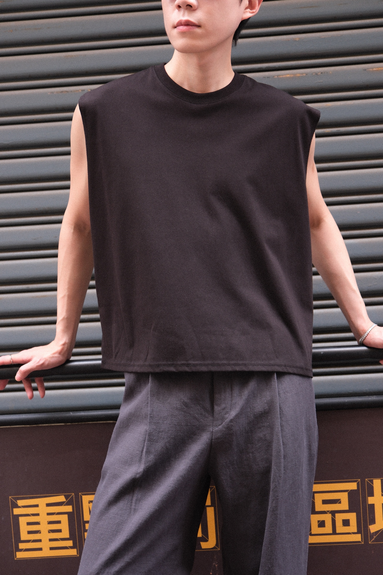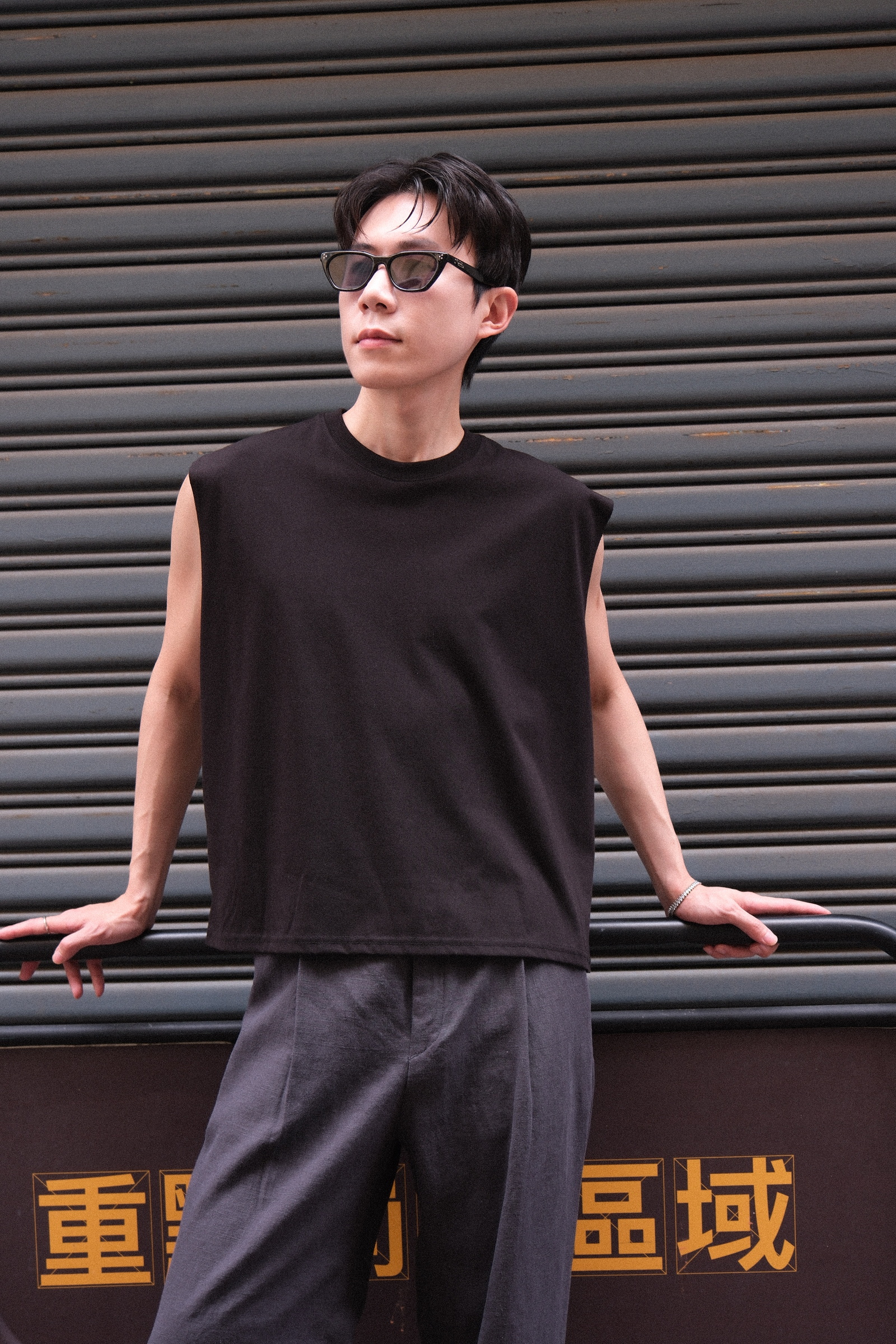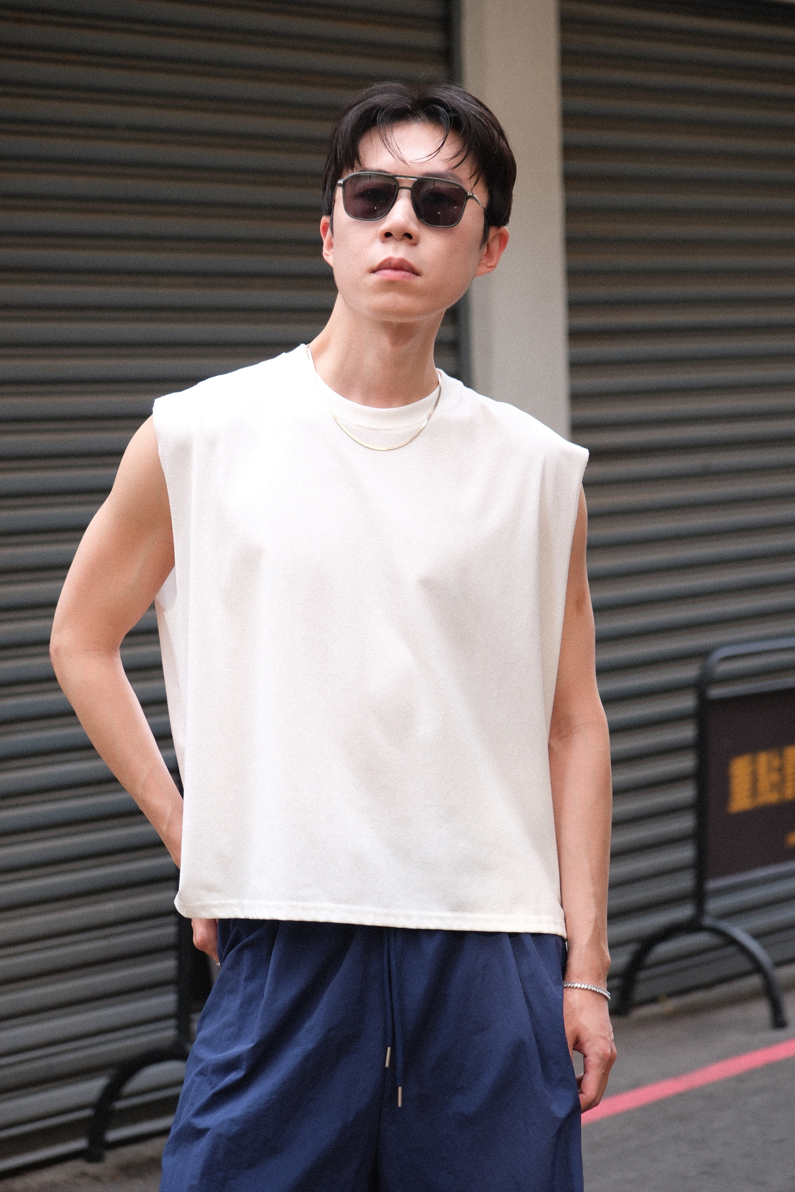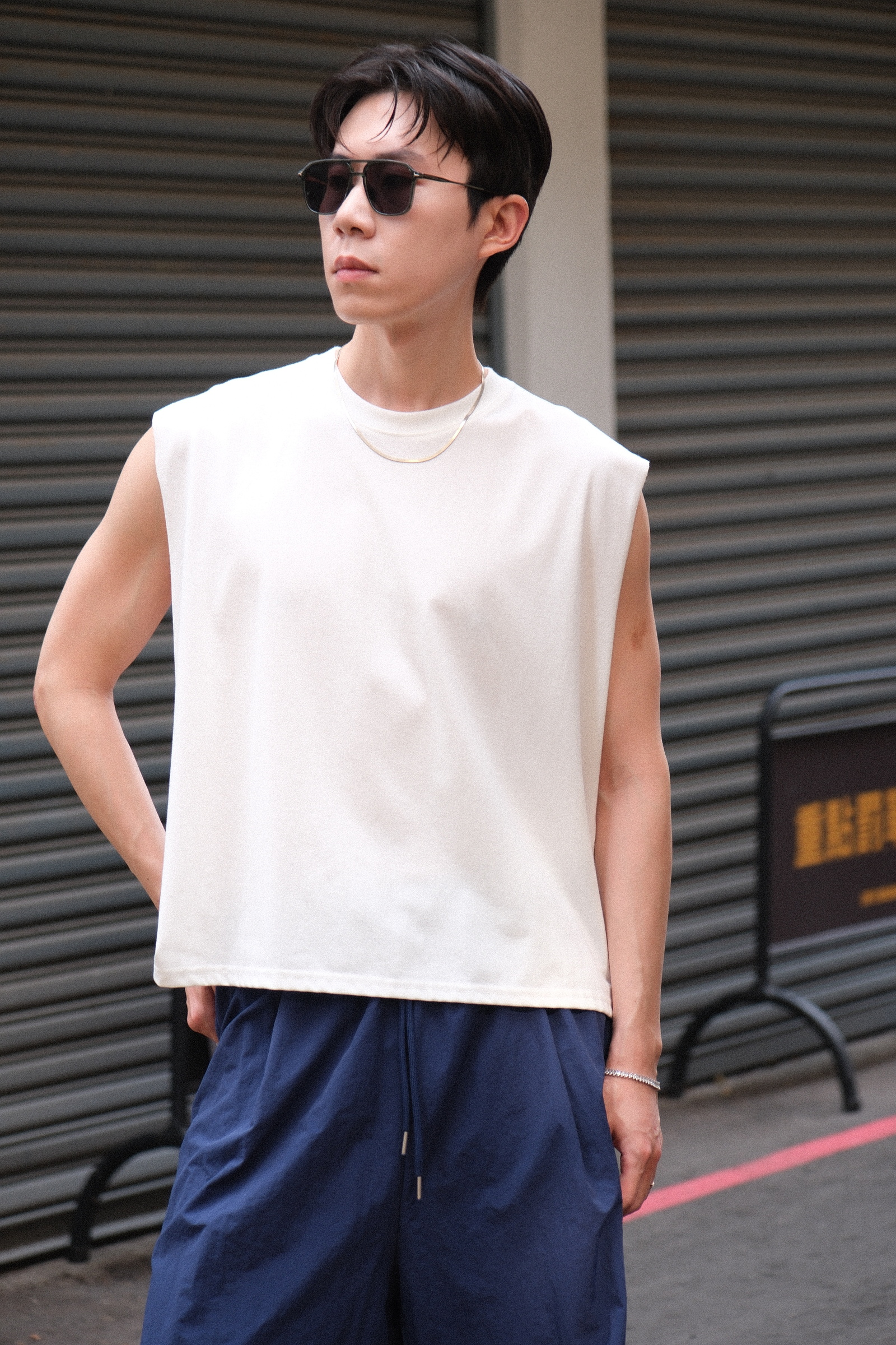 版型上肩膀寬蓋住肩頭,像是件T恤 但裁掉袖子