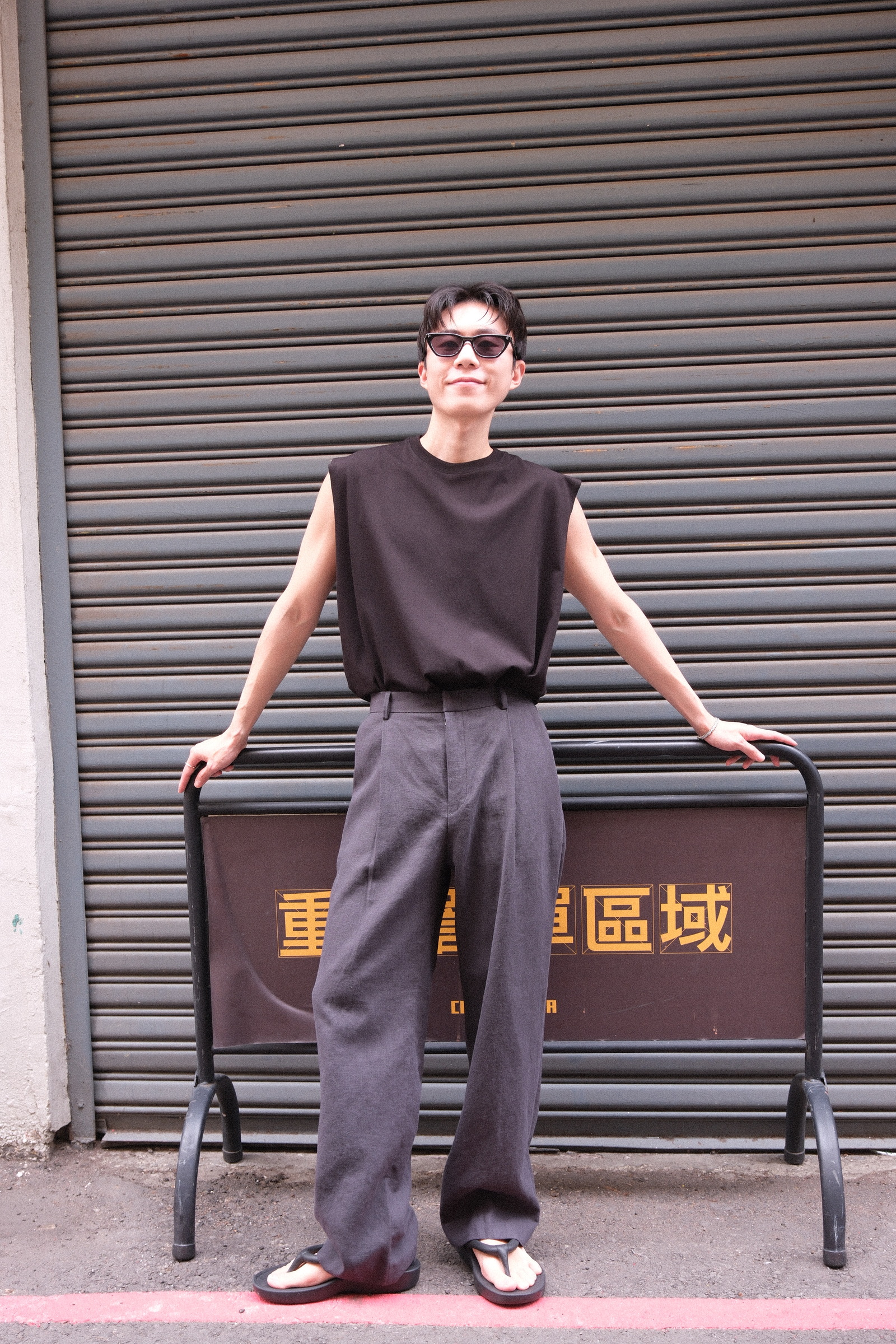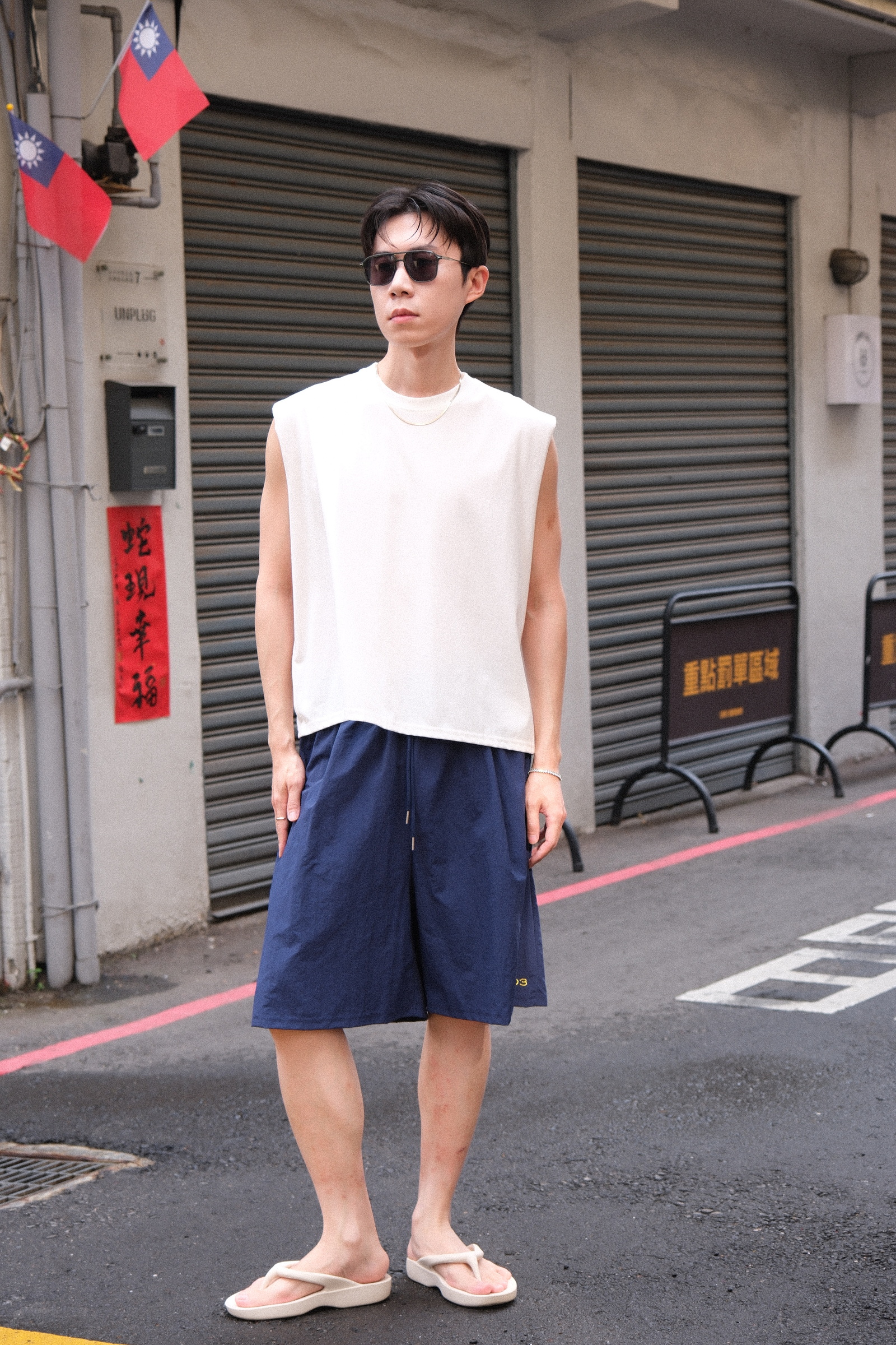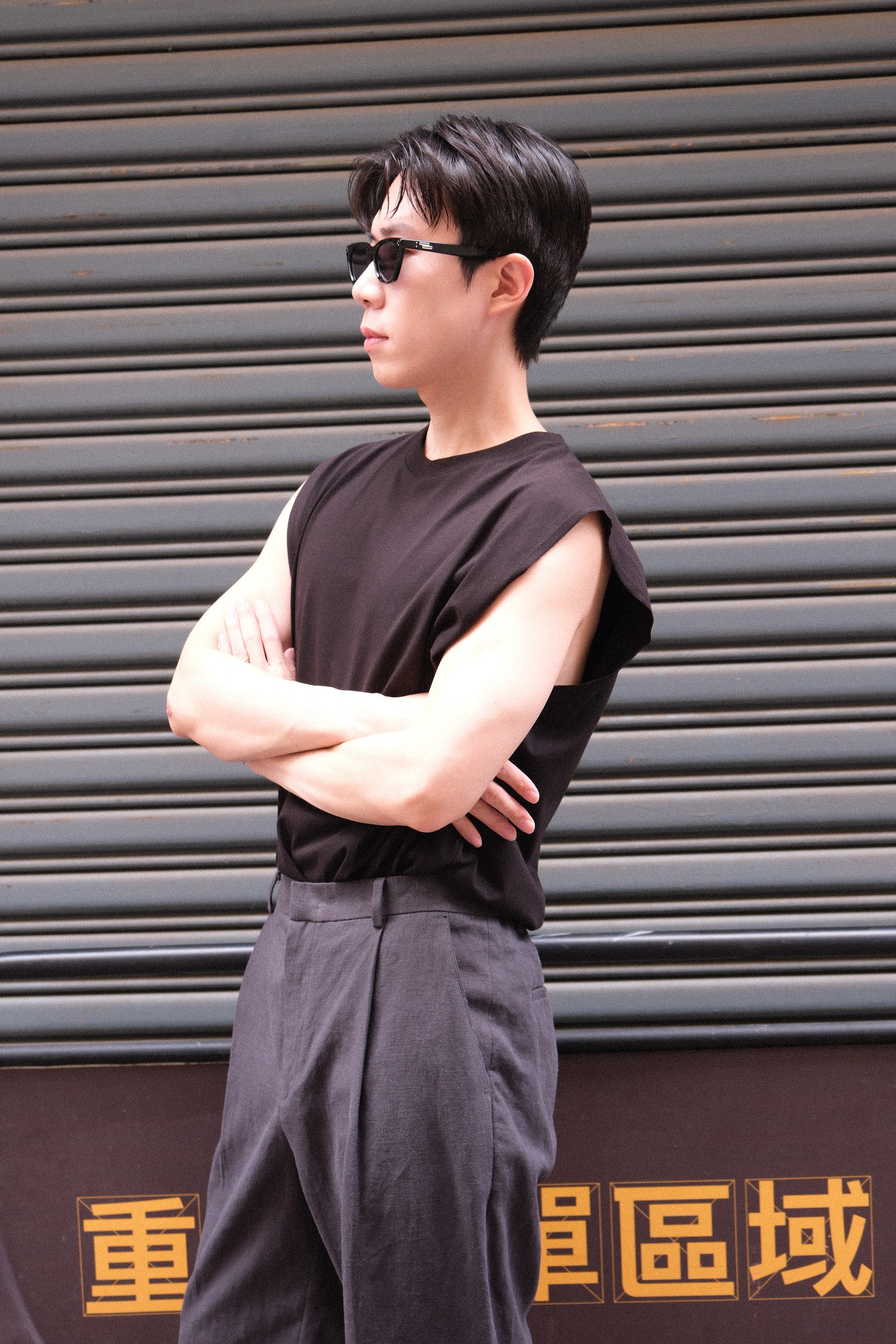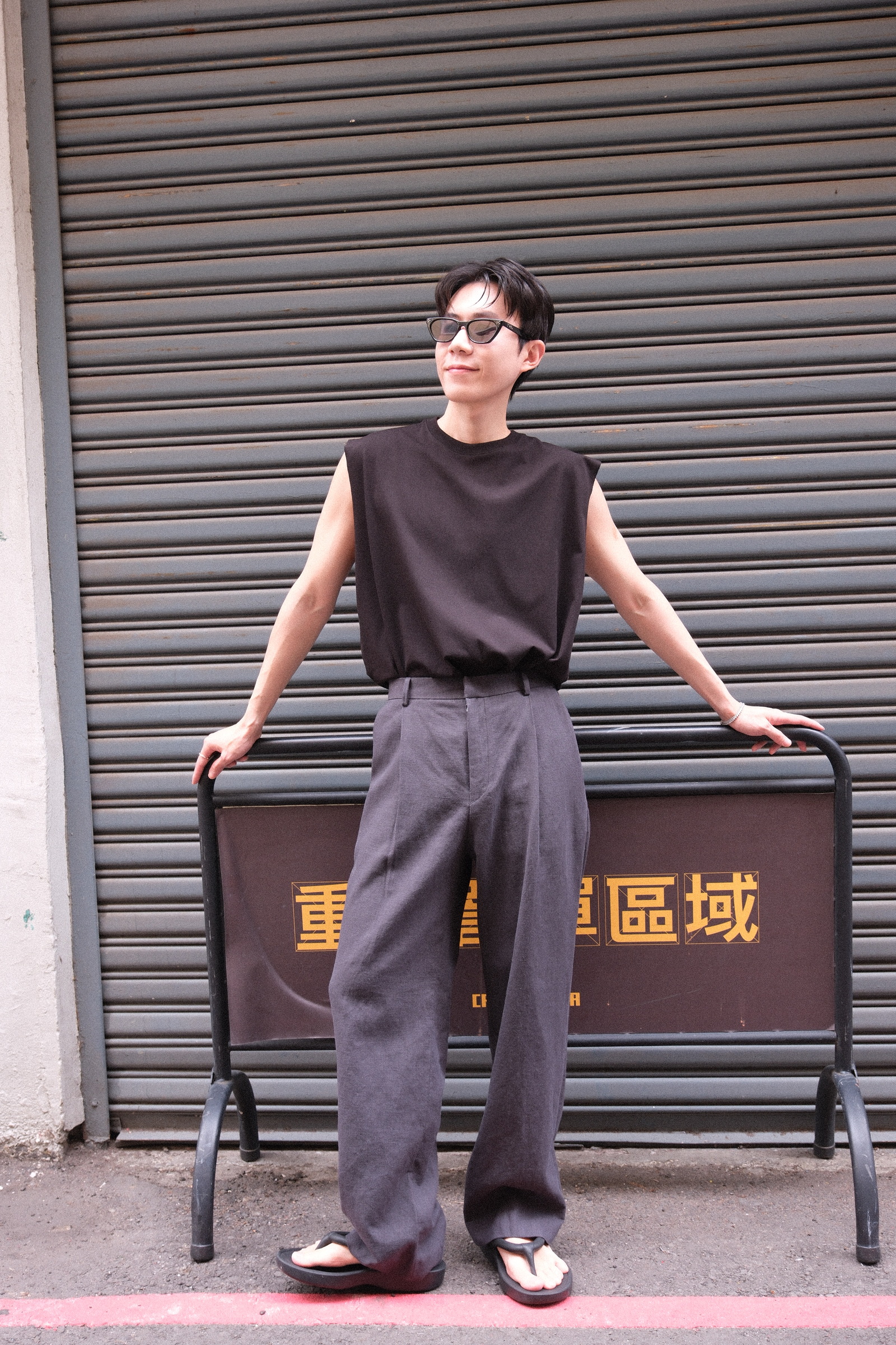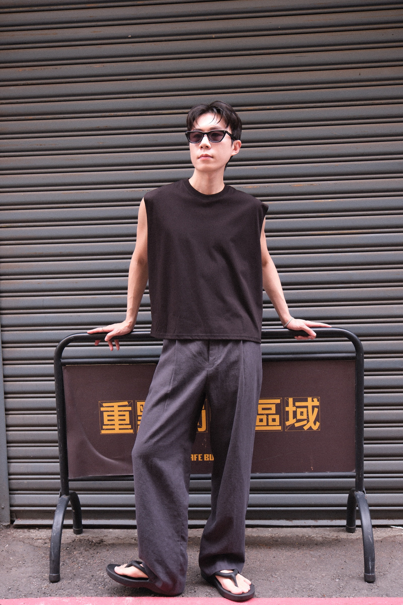 版型上肩膀寬蓋住肩頭,像是件T恤 但裁掉袖子