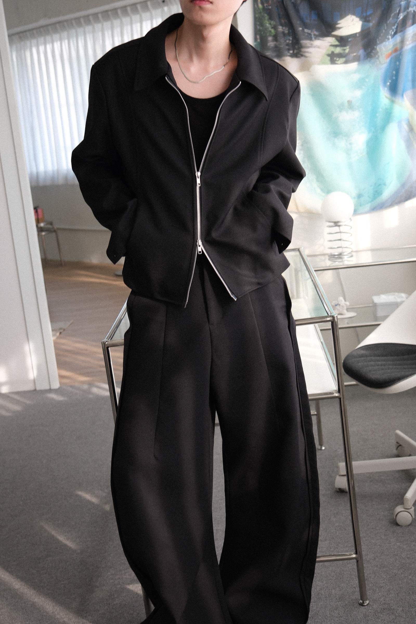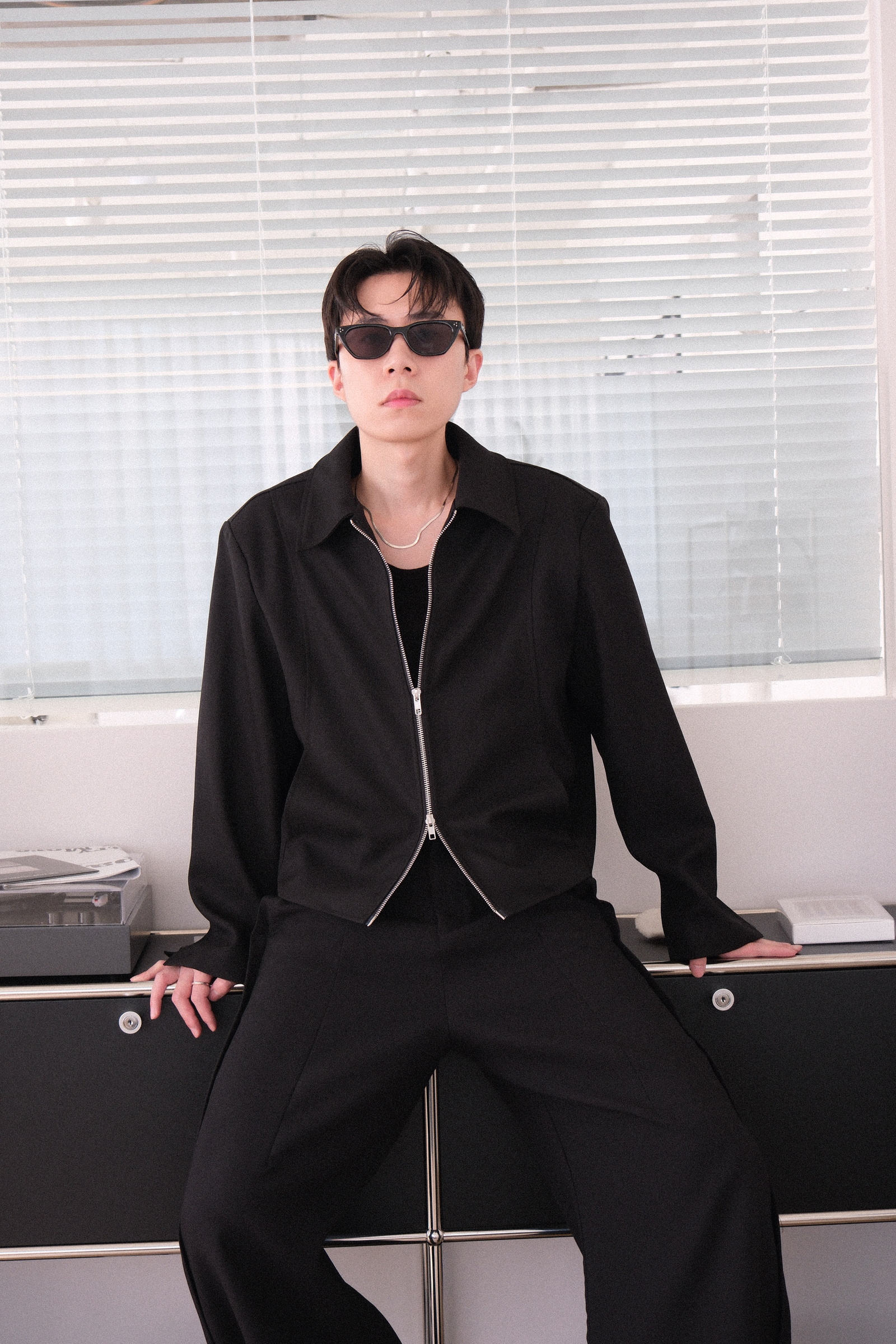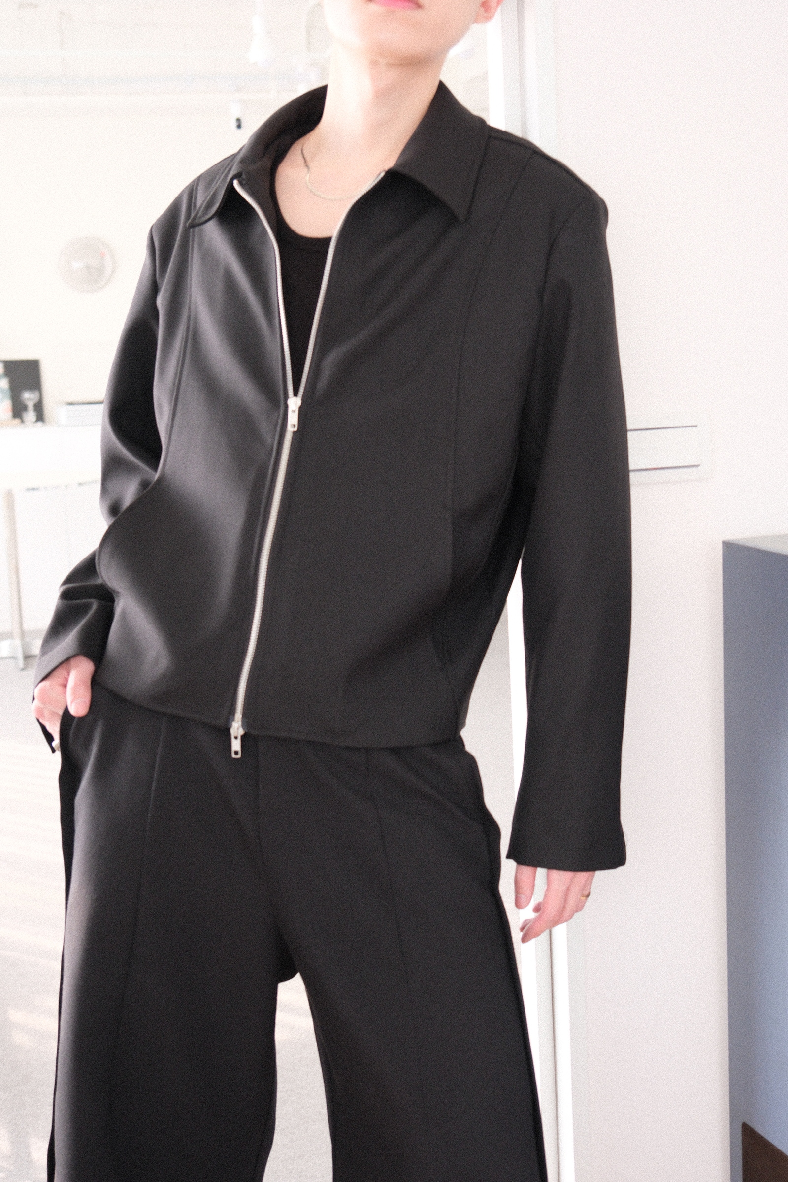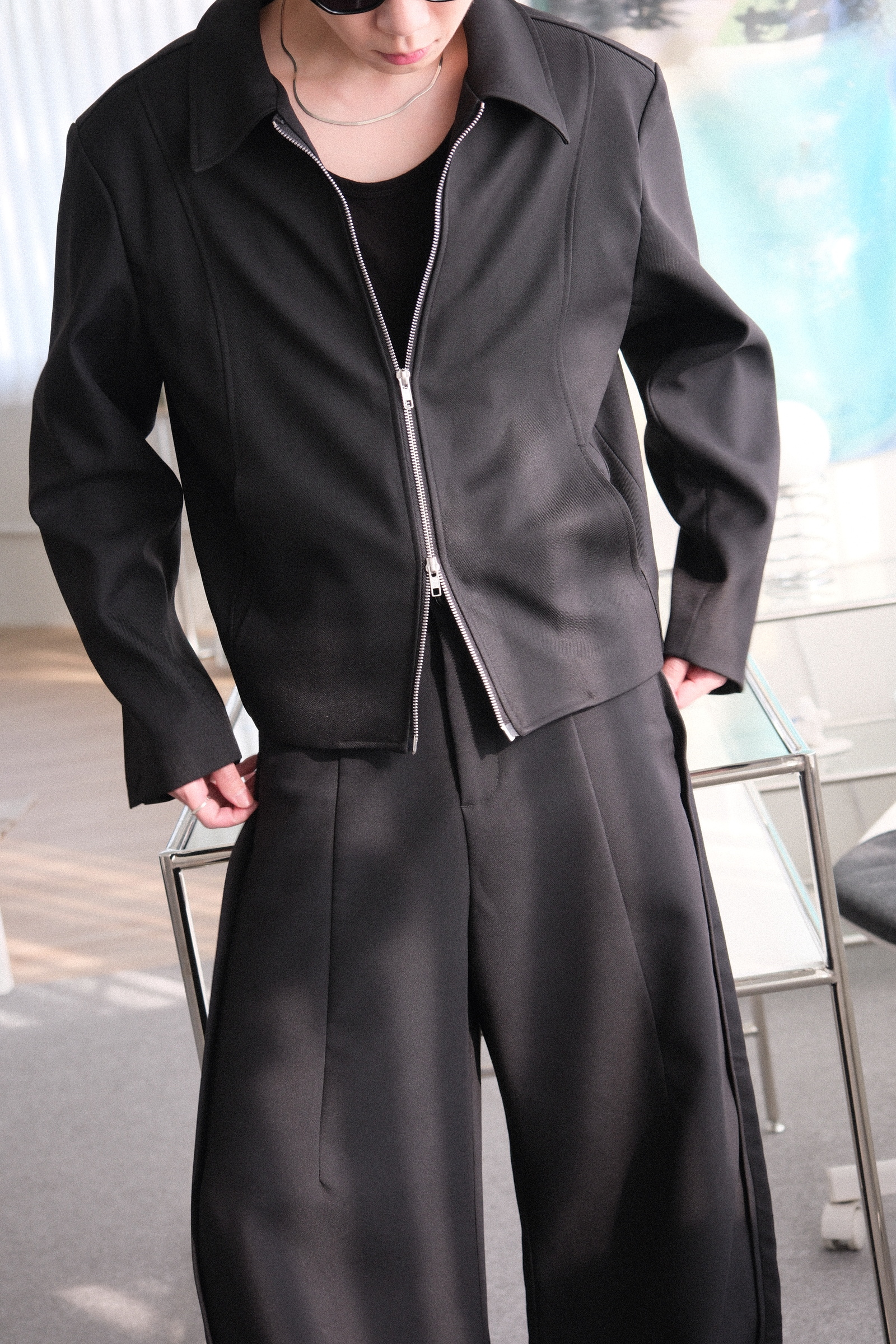 雙拉鏈版型,肩線俐落,下擺微收,呈現倒三角形