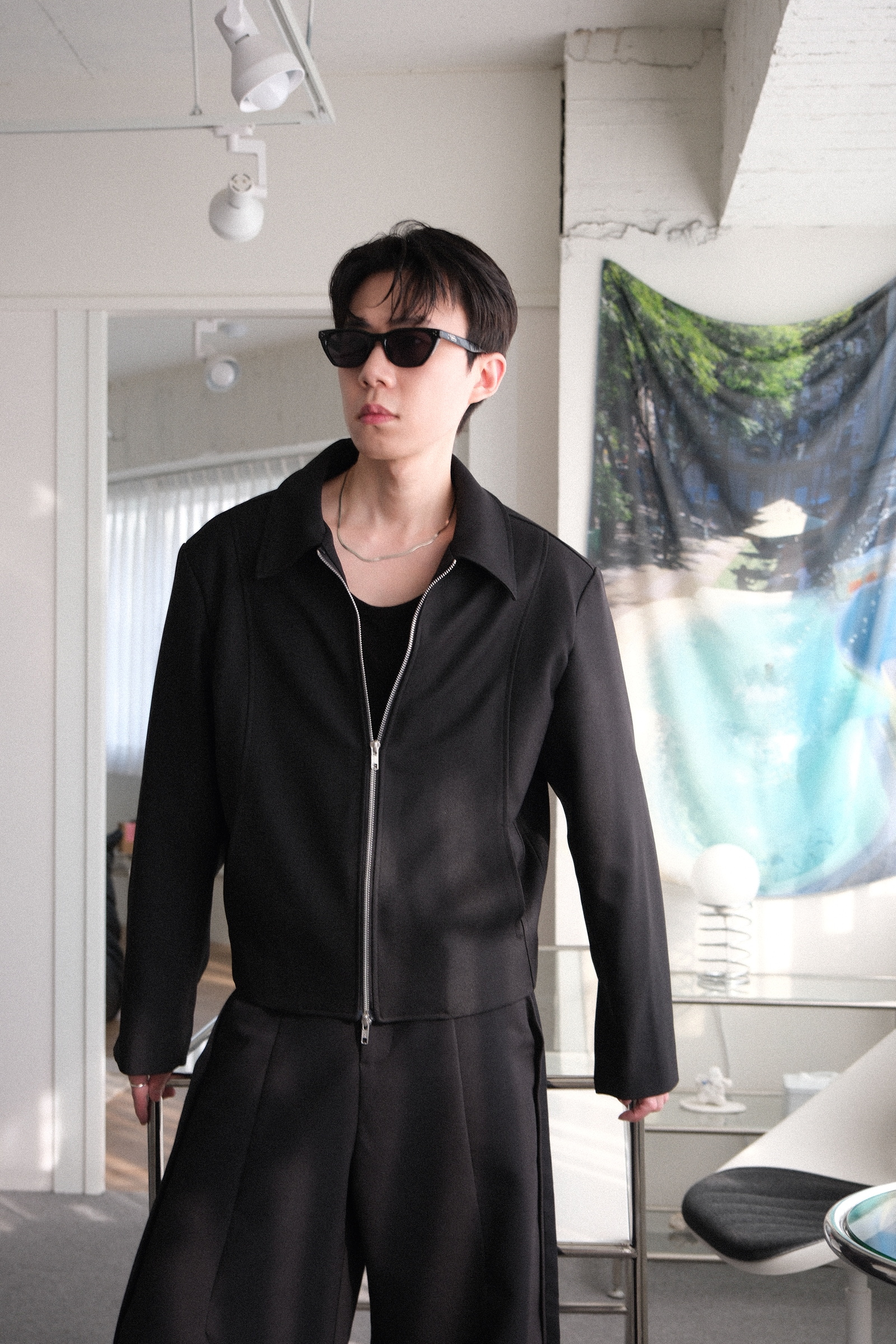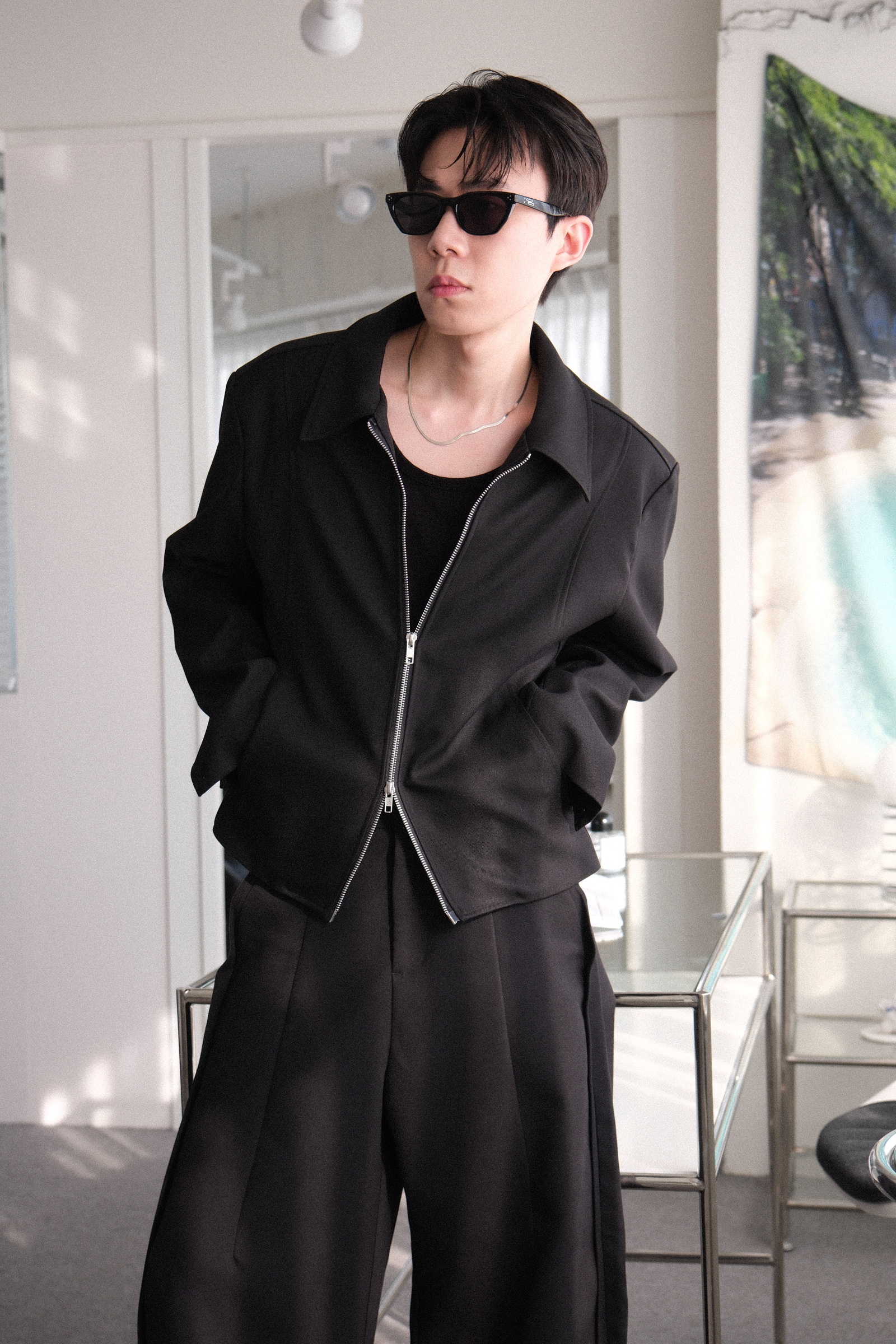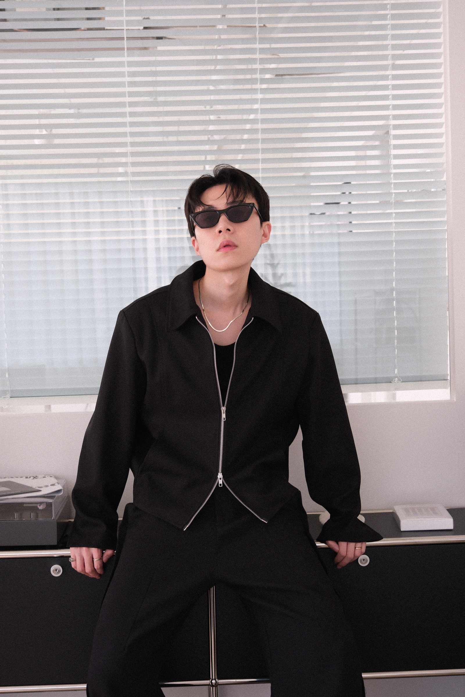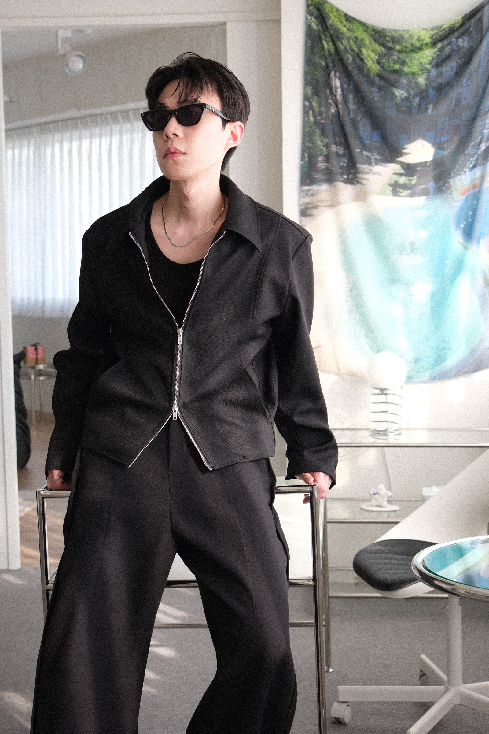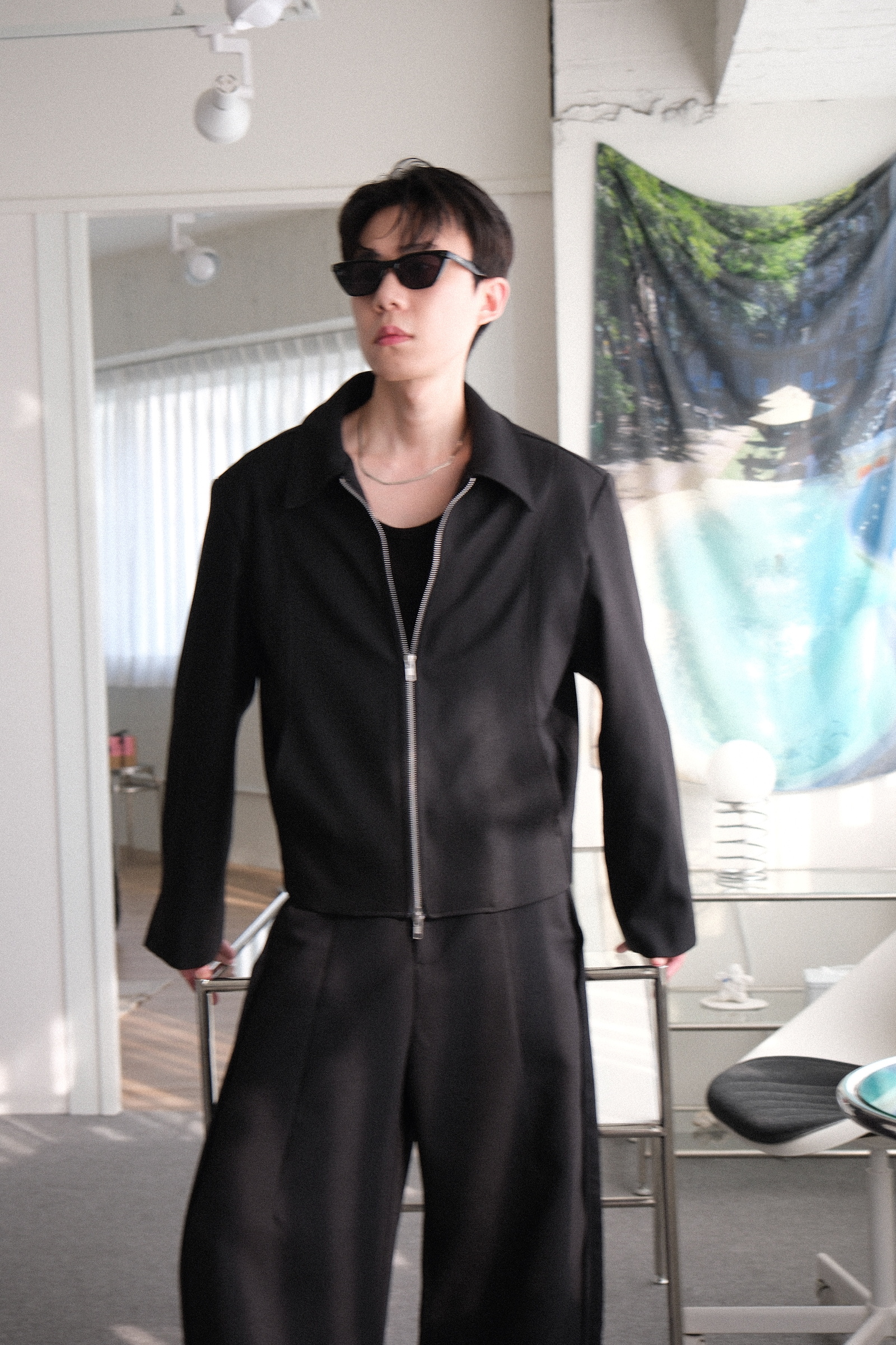 雙拉鏈版型,肩線俐落,下擺微收,呈現倒三角形