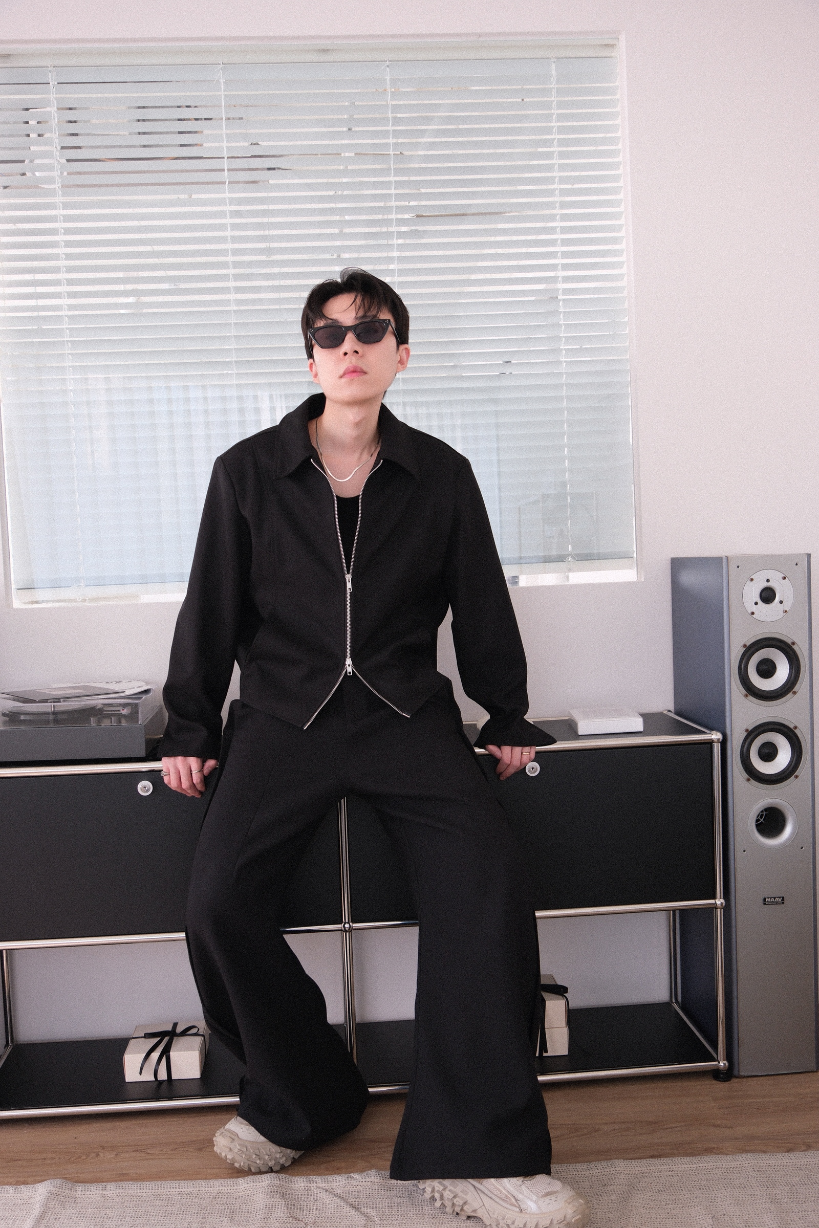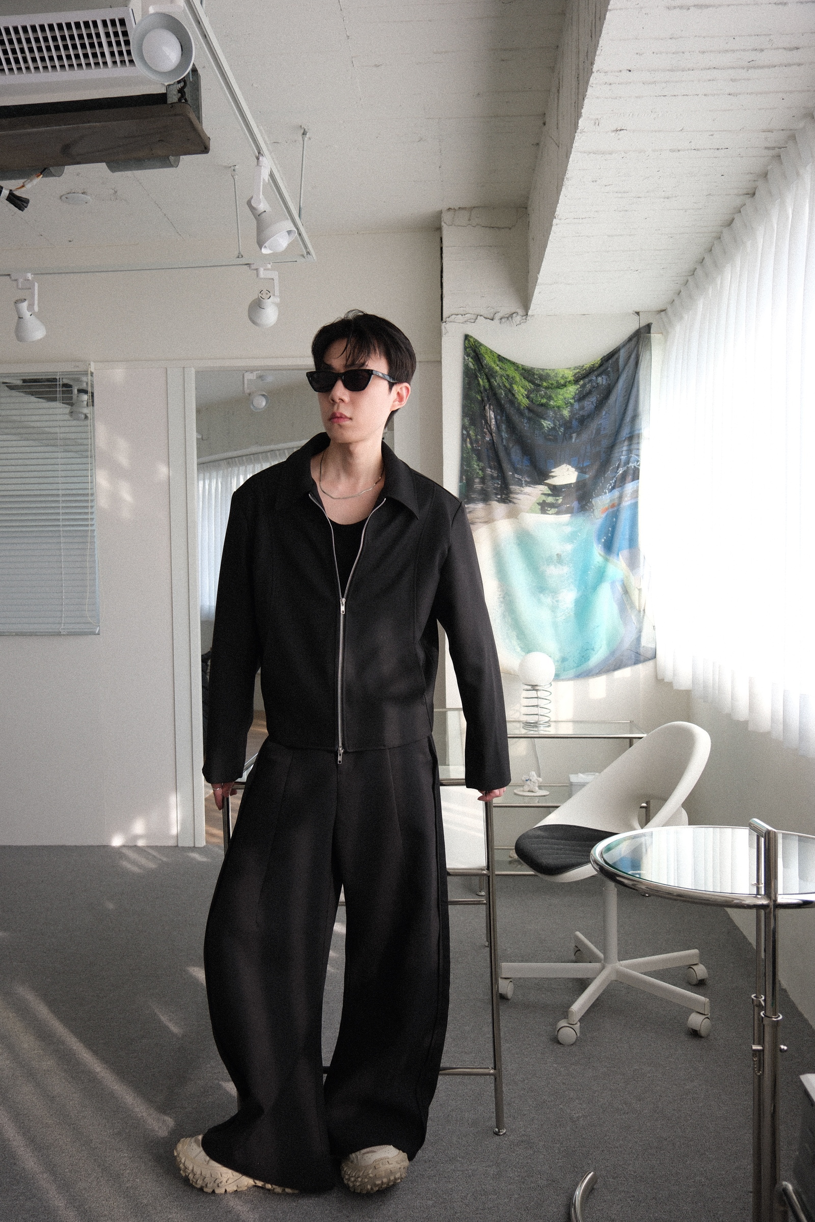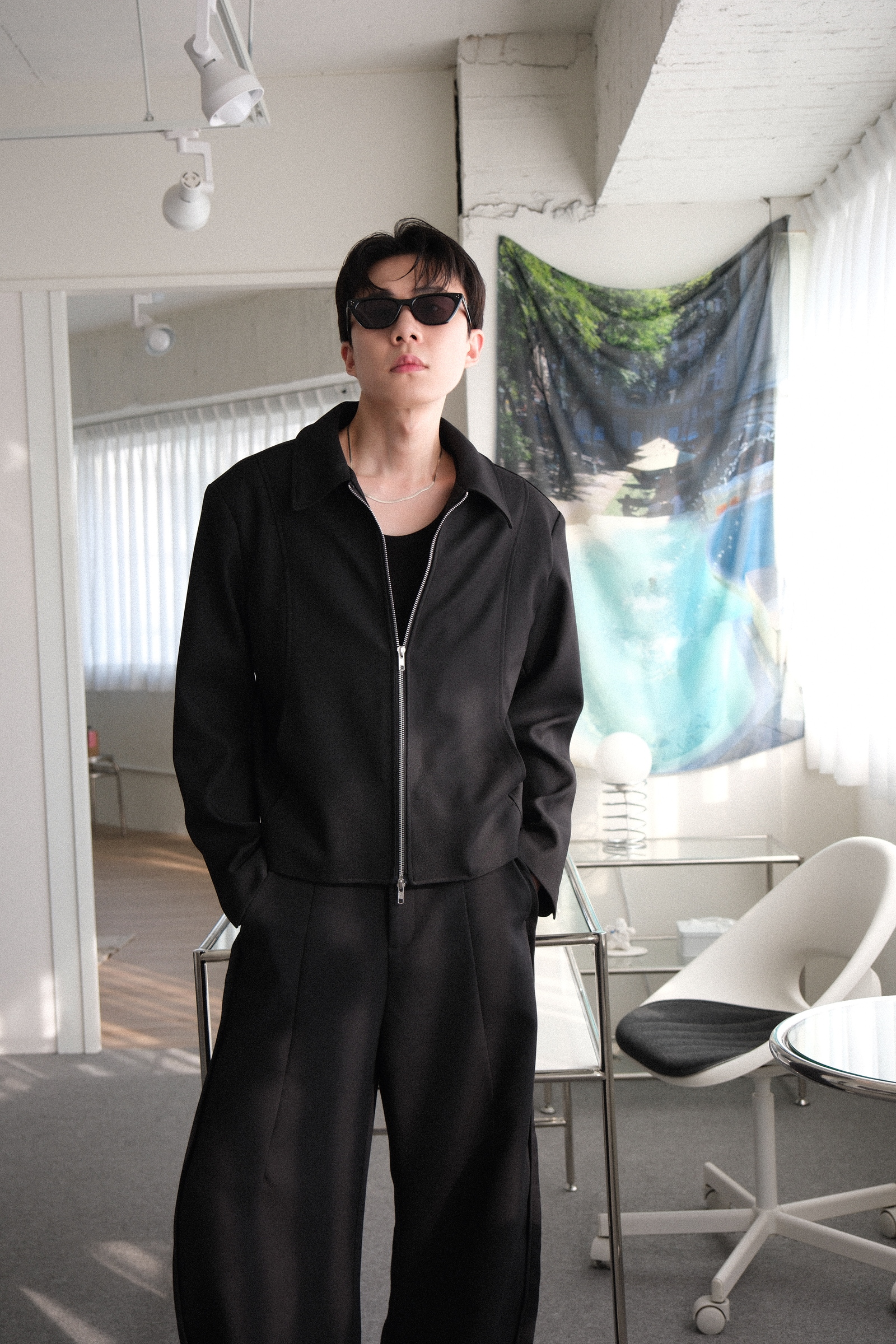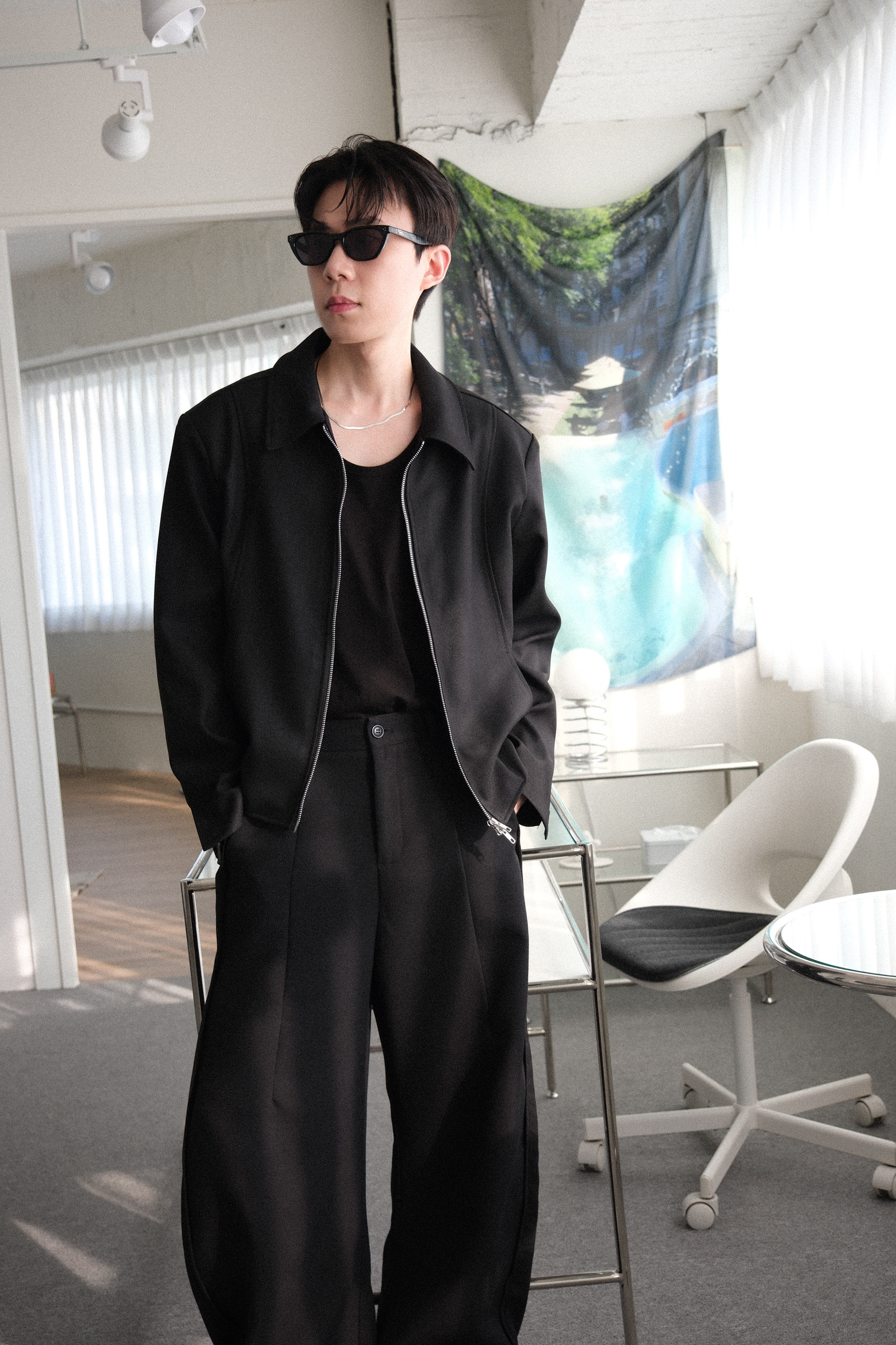 雙拉鏈版型,肩線俐落,下擺微收,呈現倒三角形