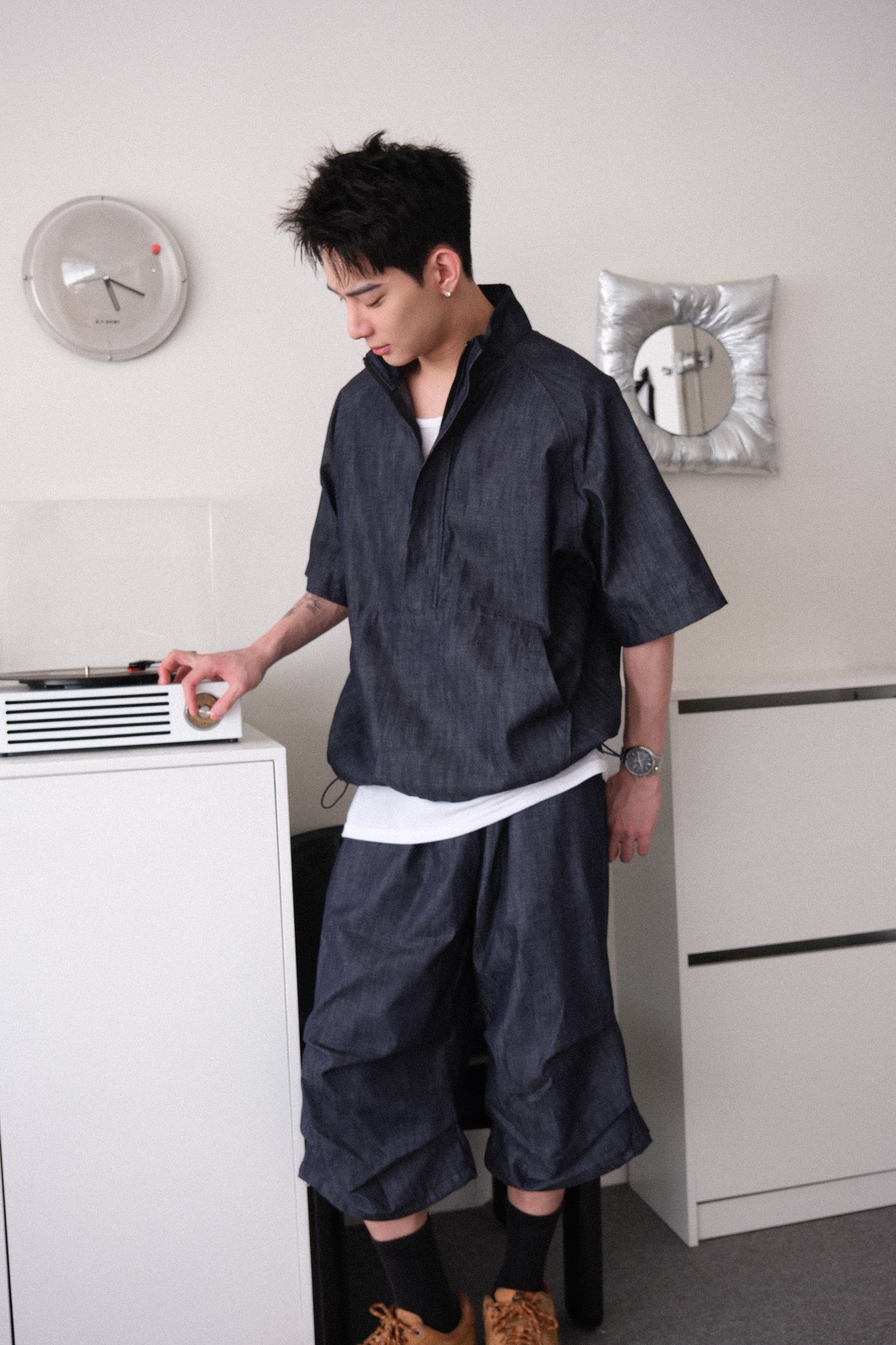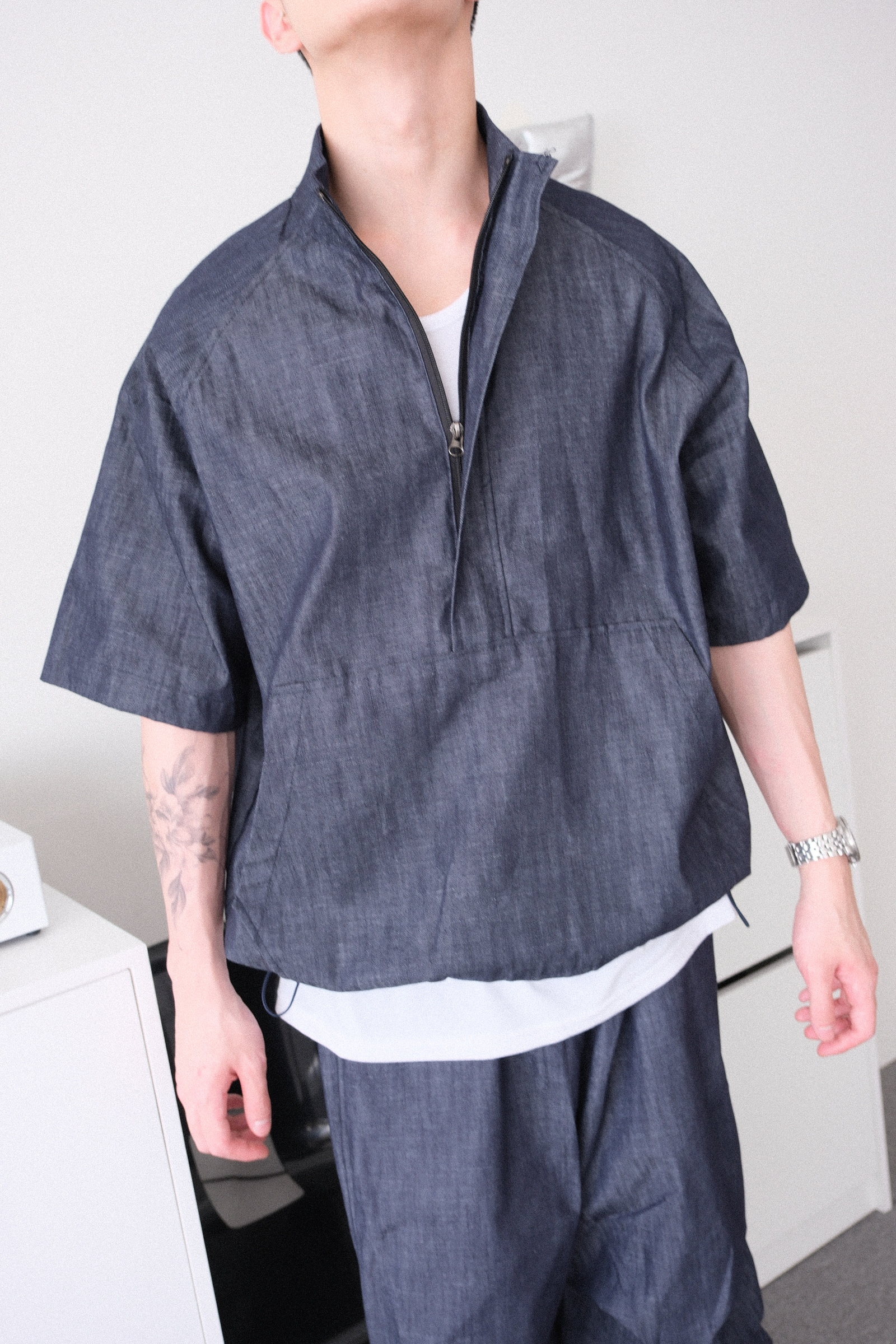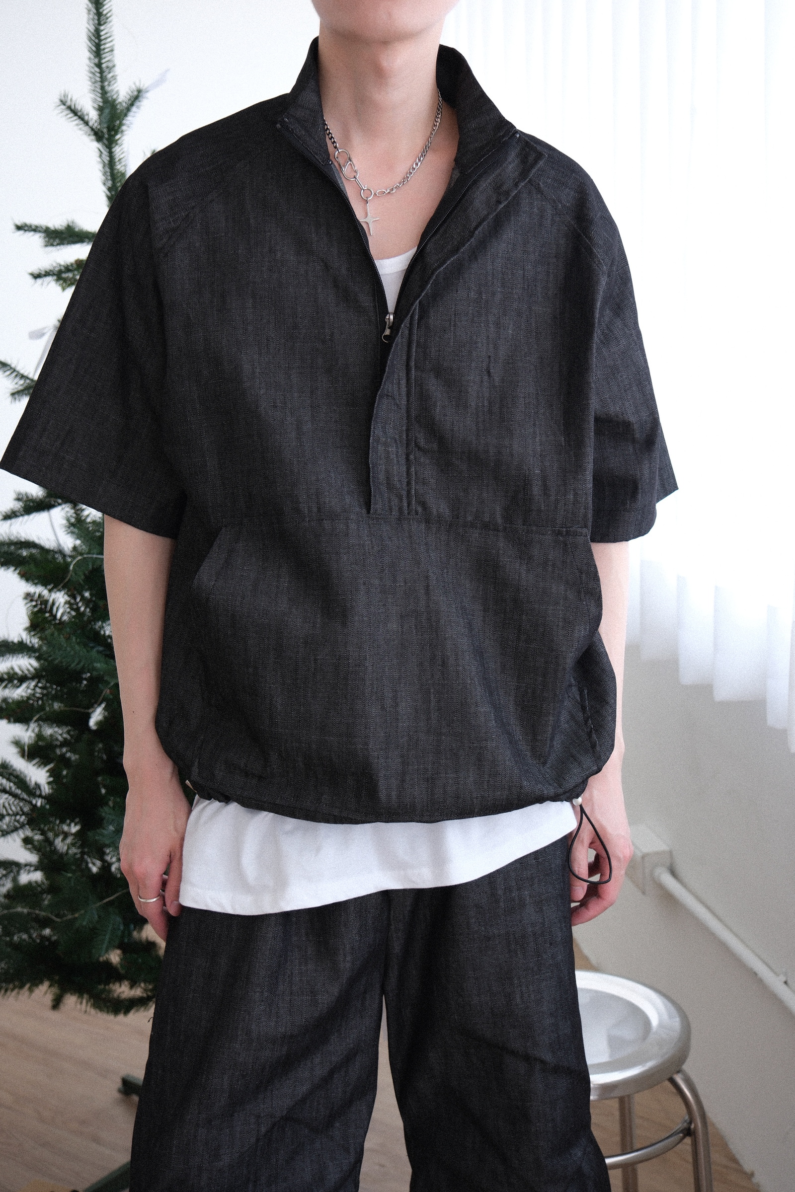 上衣是衝鋒衣版型,下擺可抽繩