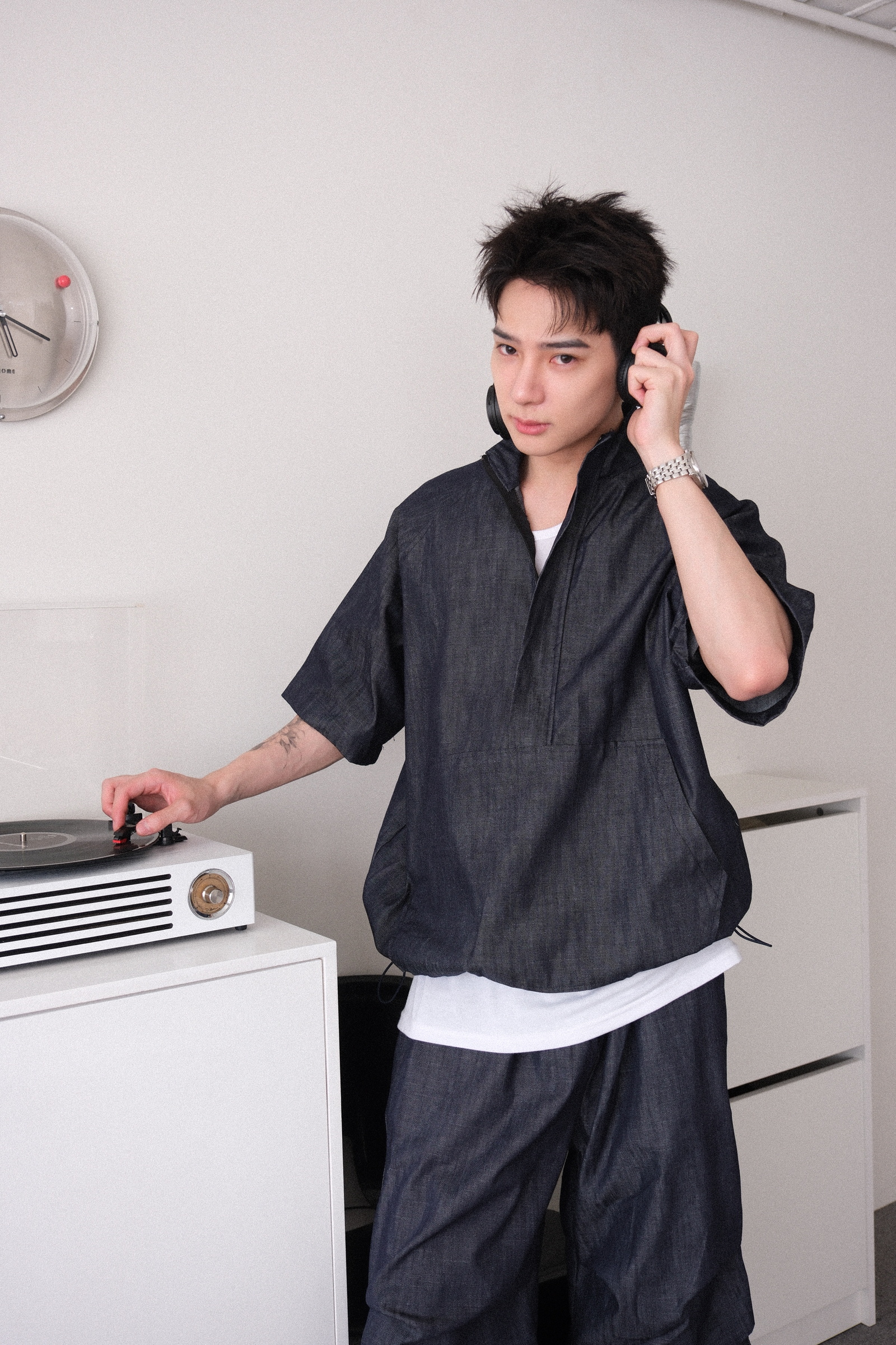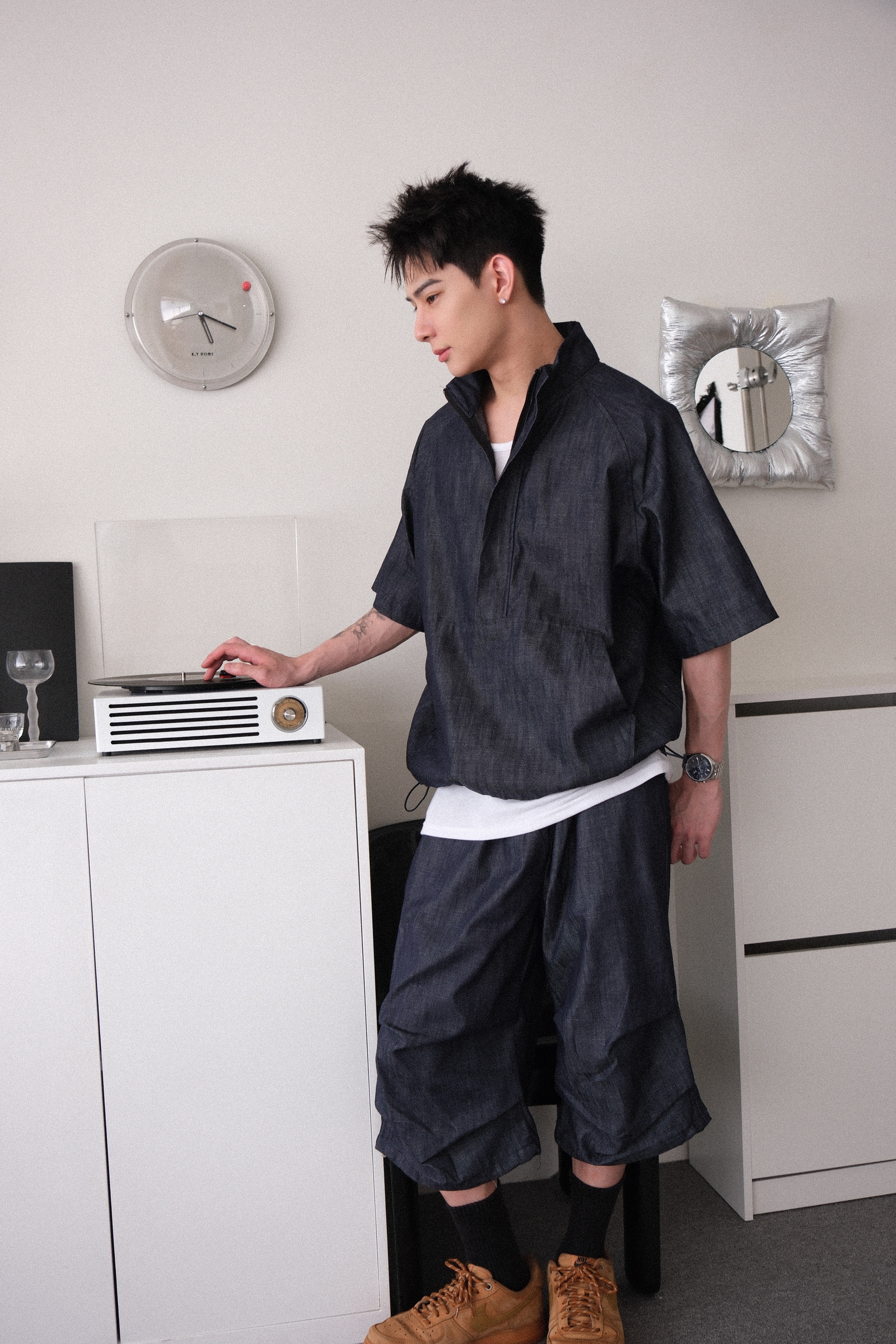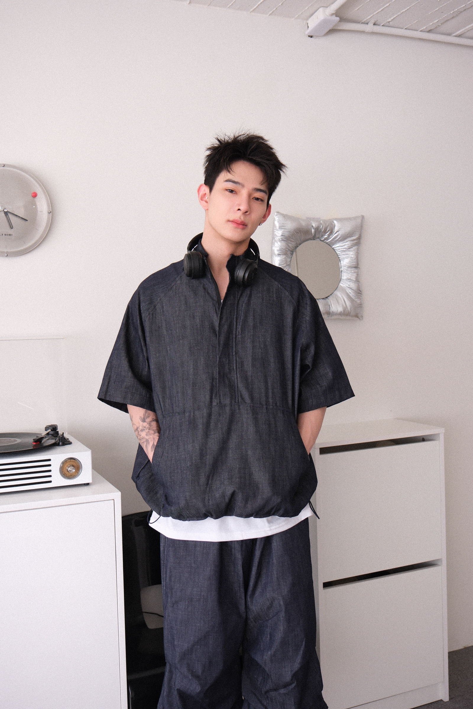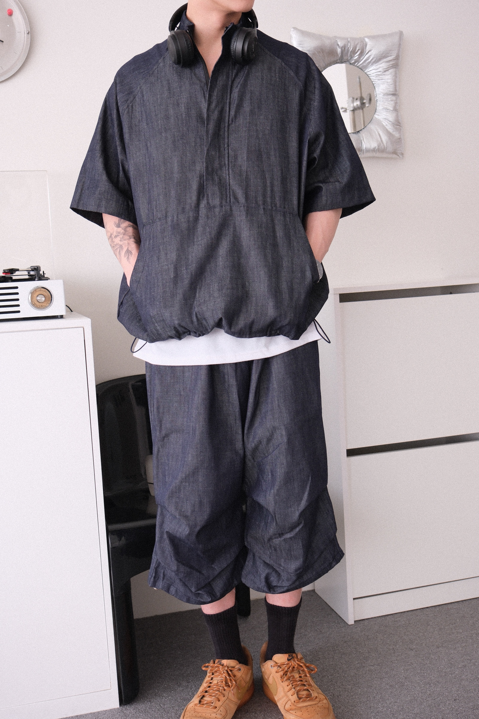 上衣是衝鋒衣版型,下擺可抽繩