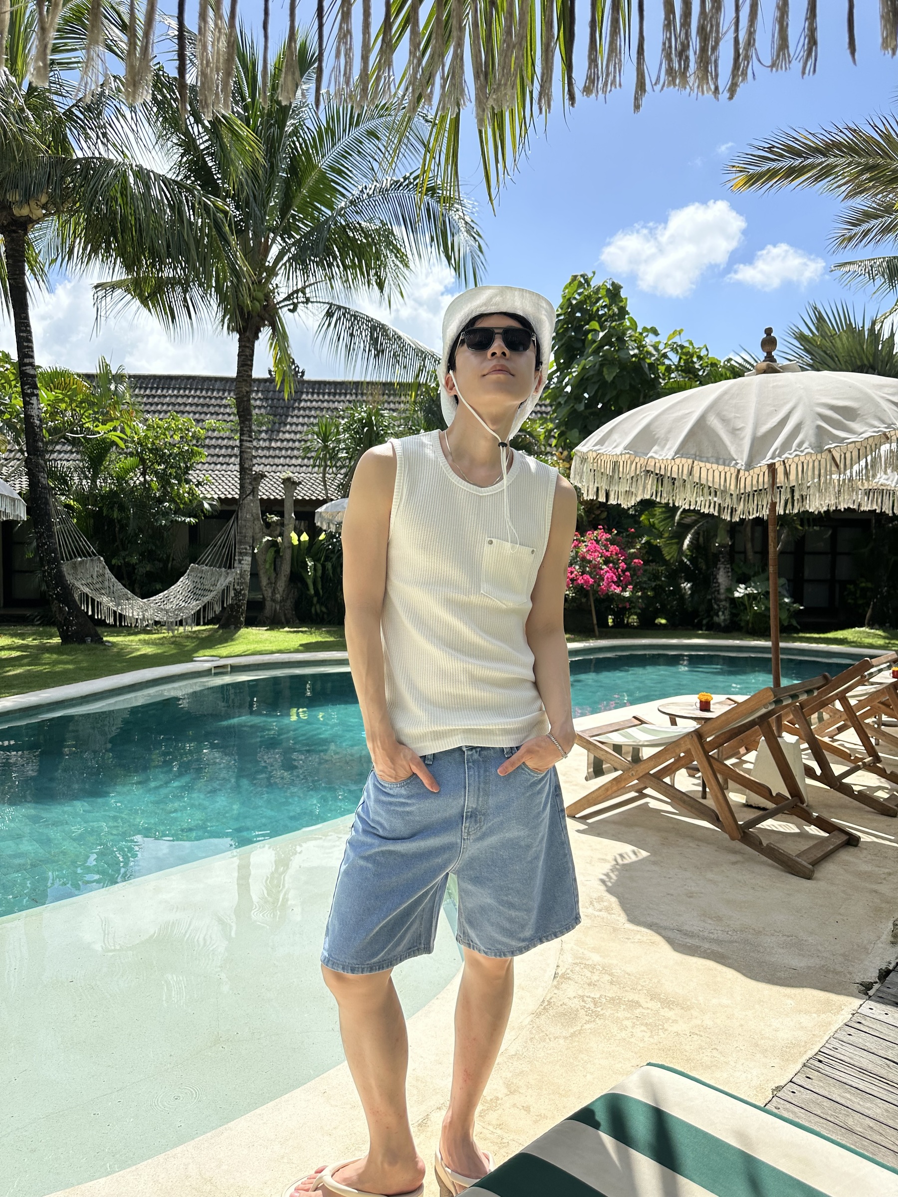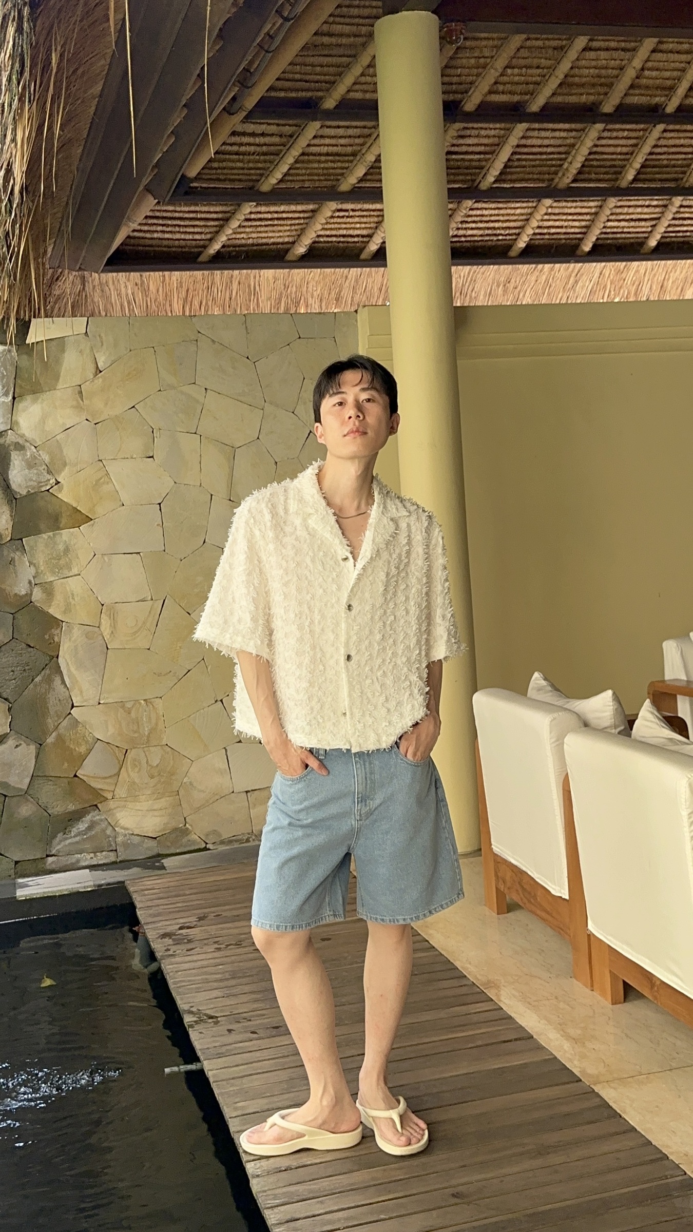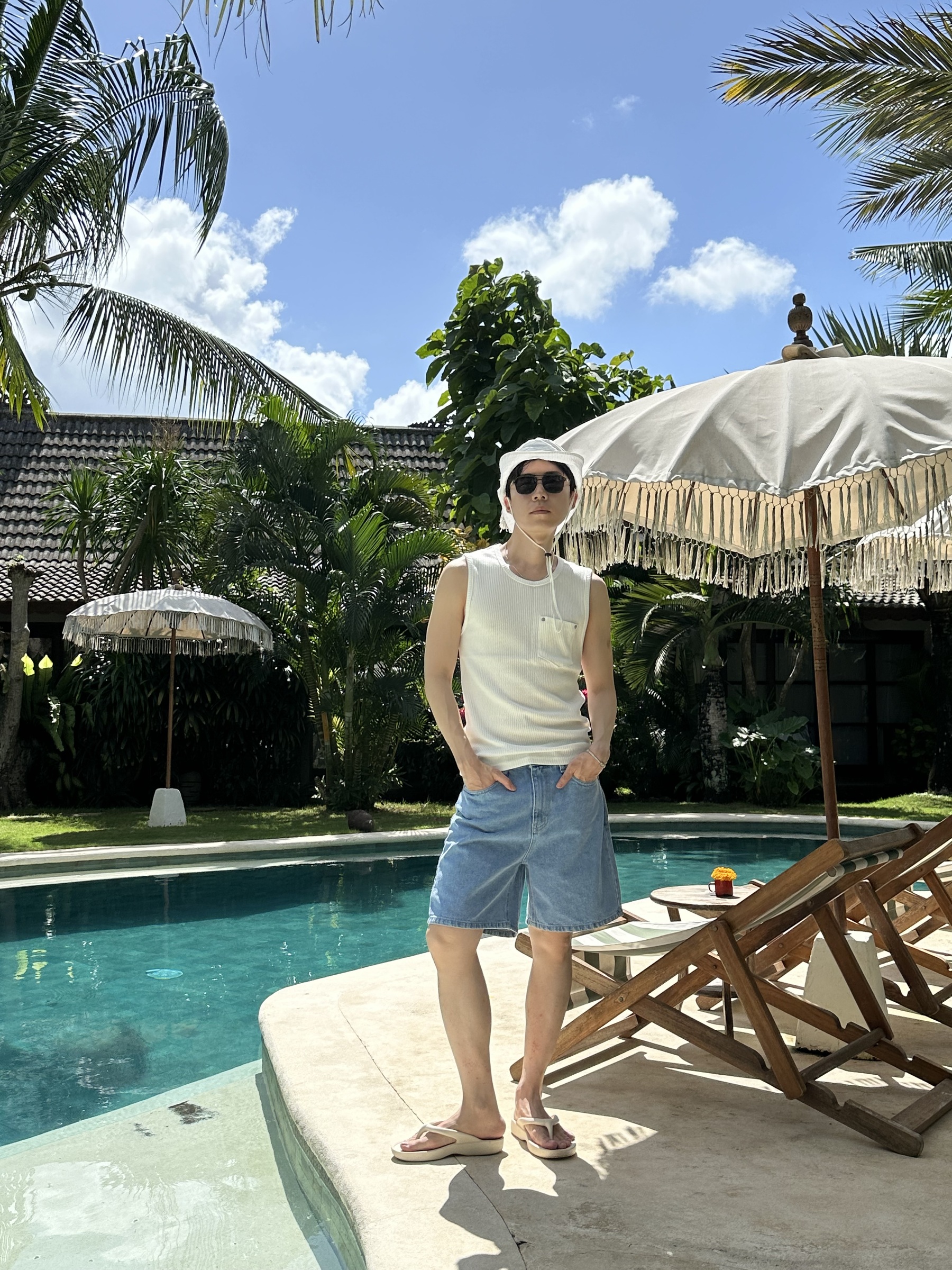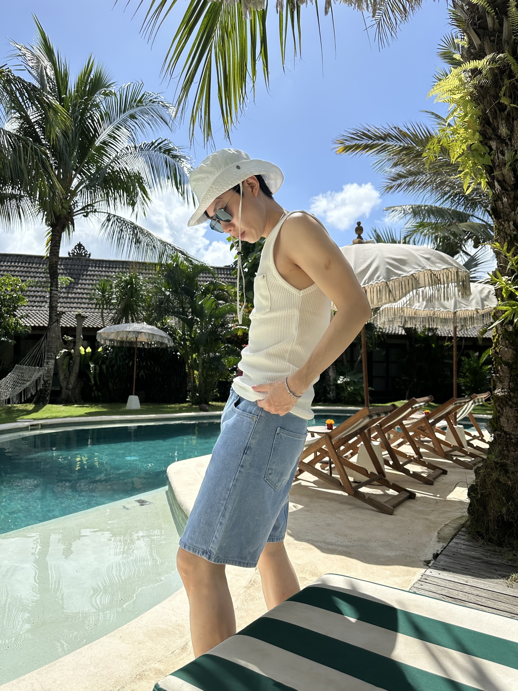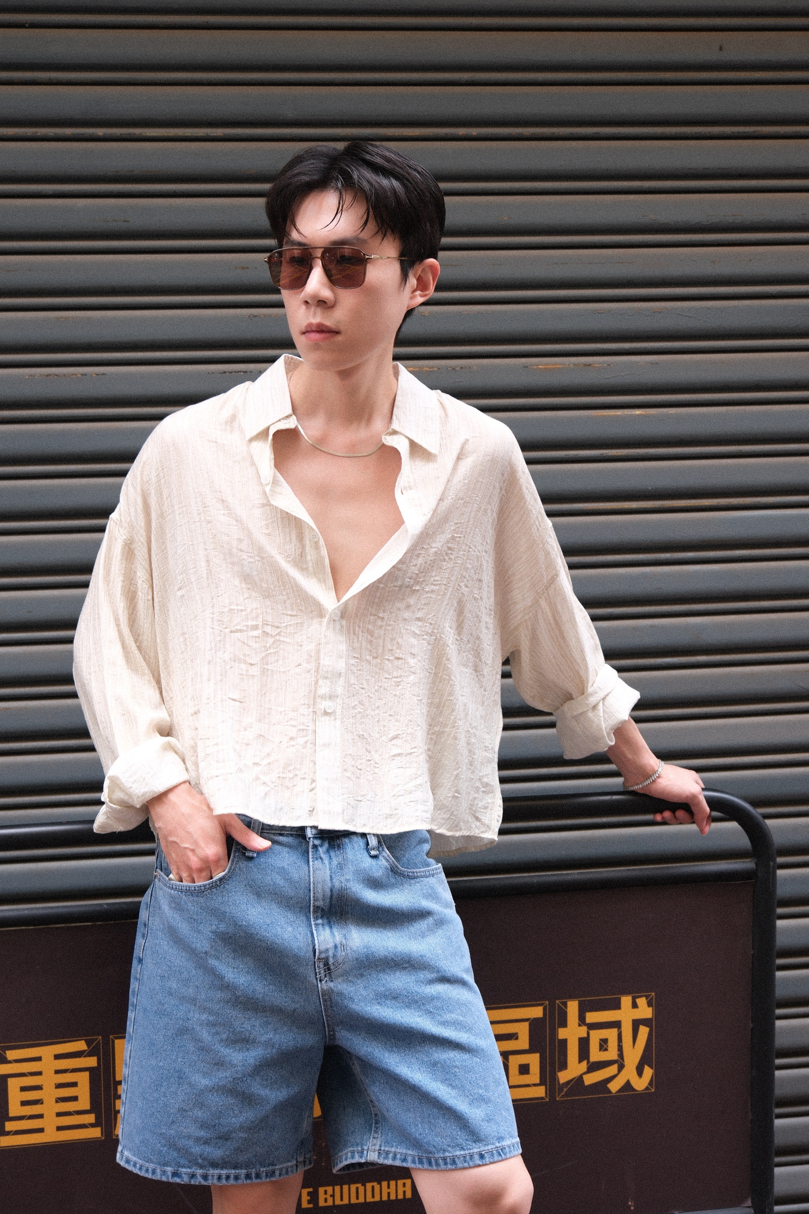 牛仔褲版型五分再短一些些,在台灣拍攝的是藍色,場景比較漂亮的是淺藍色