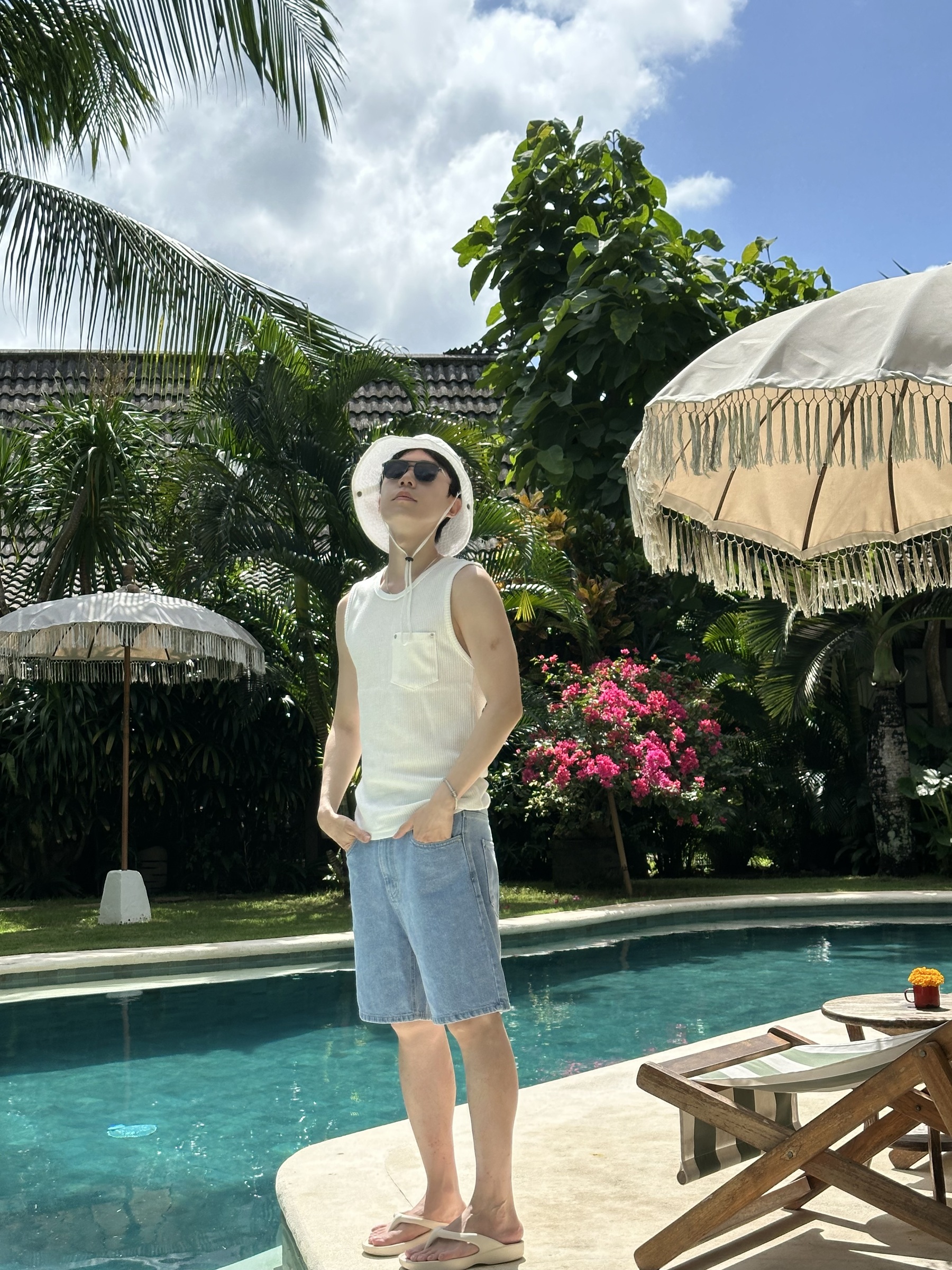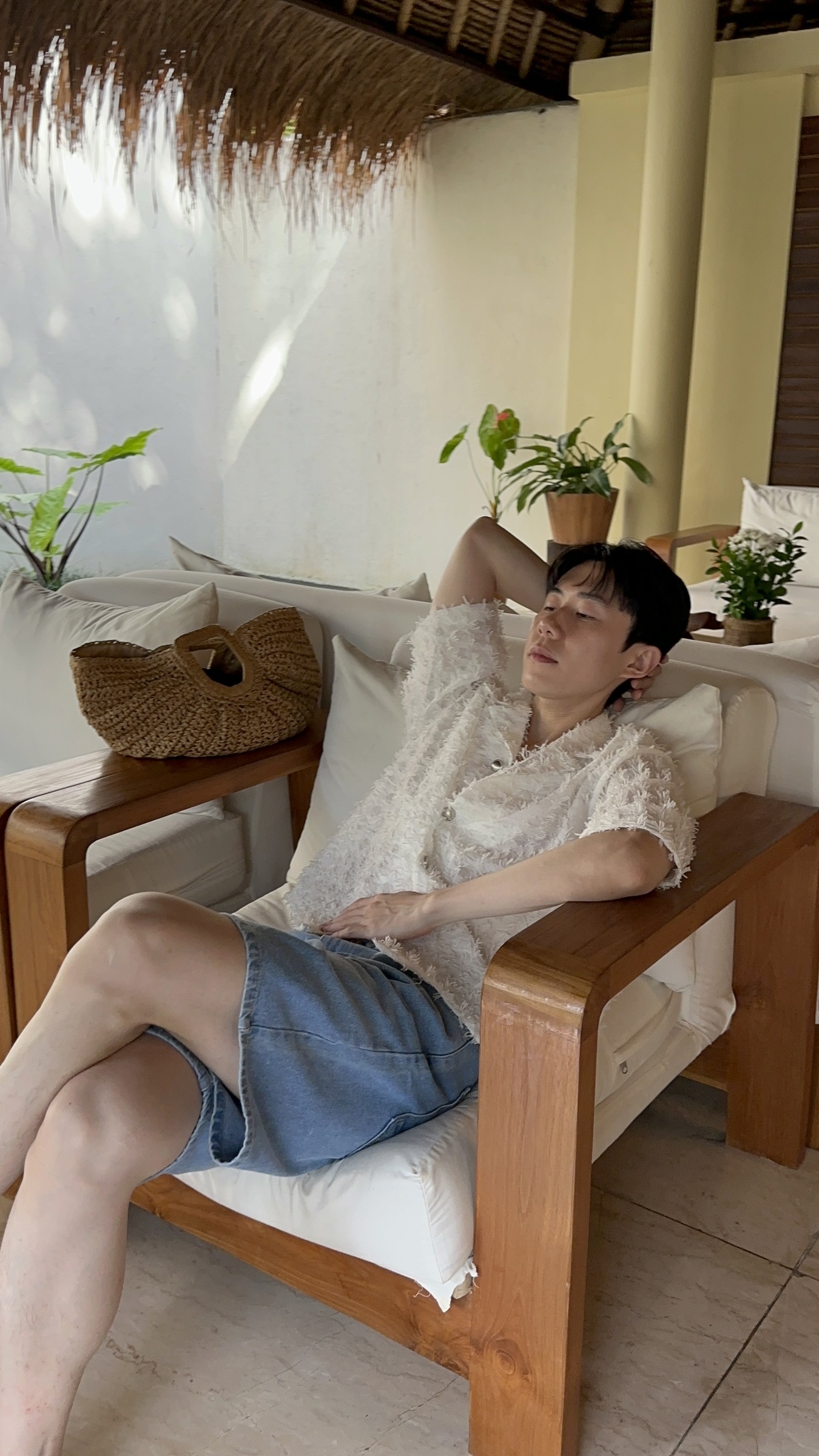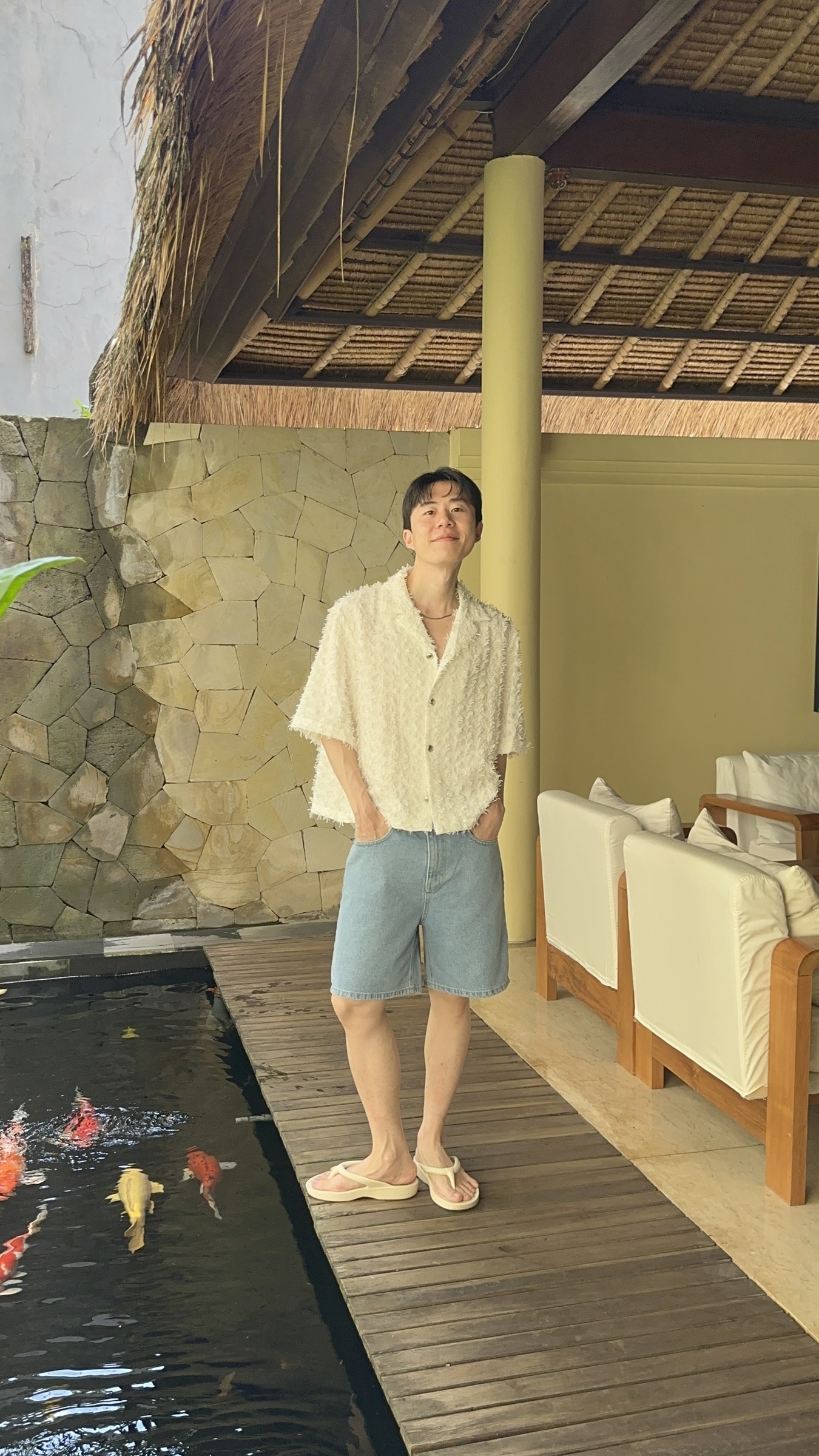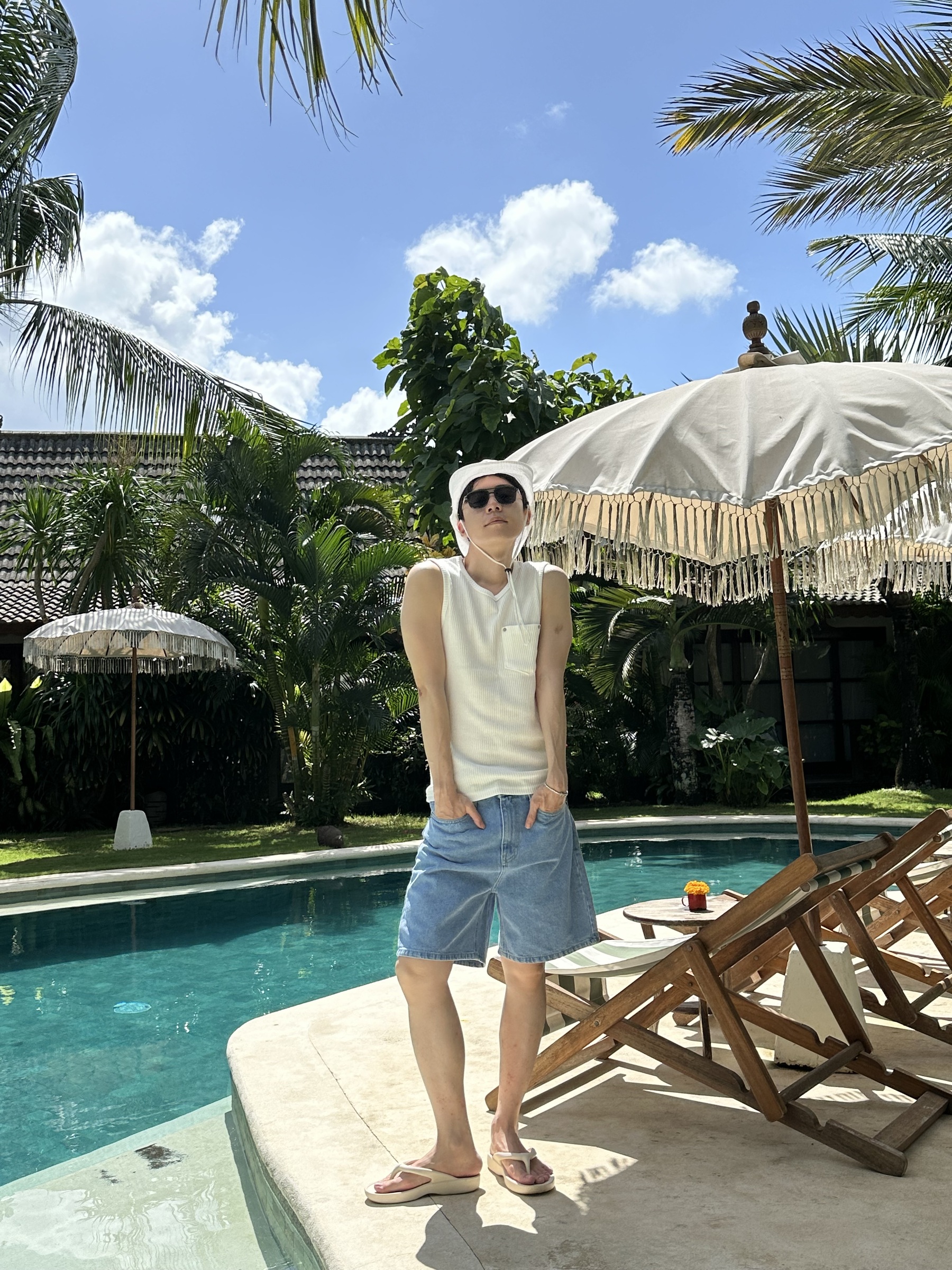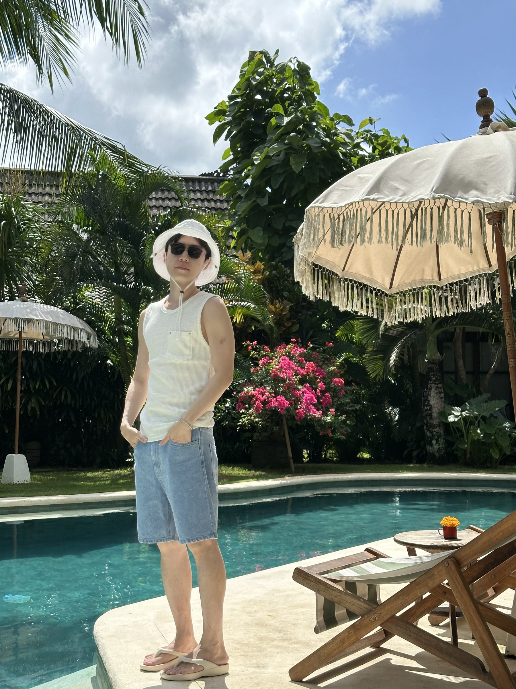 牛仔褲版型五分再短一些些,在台灣拍攝的是藍色,場景比較漂亮的是淺藍色