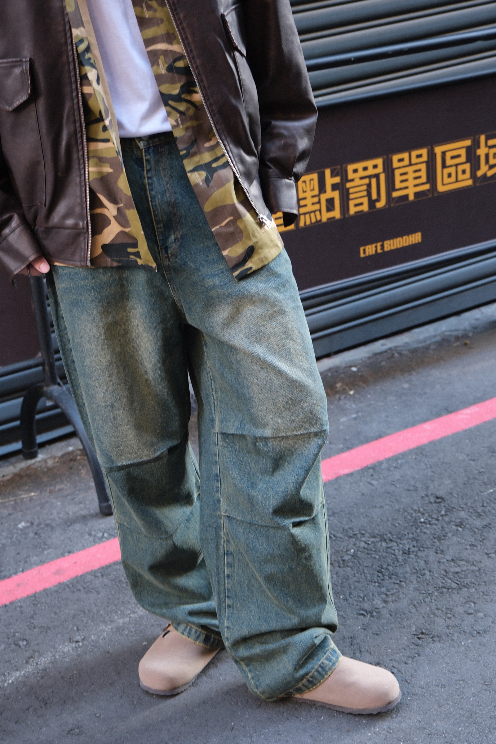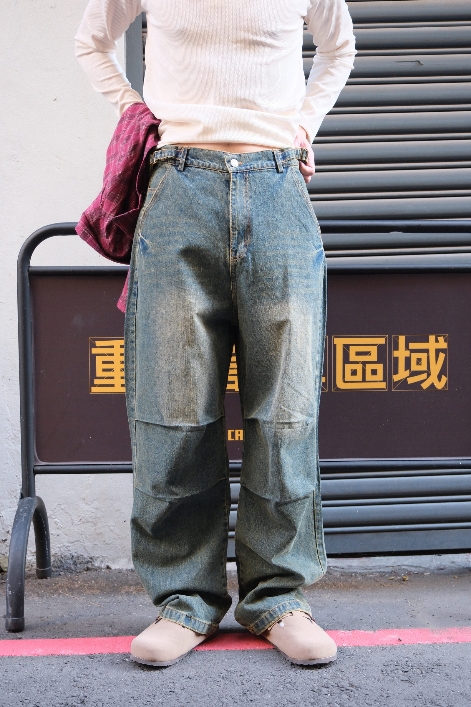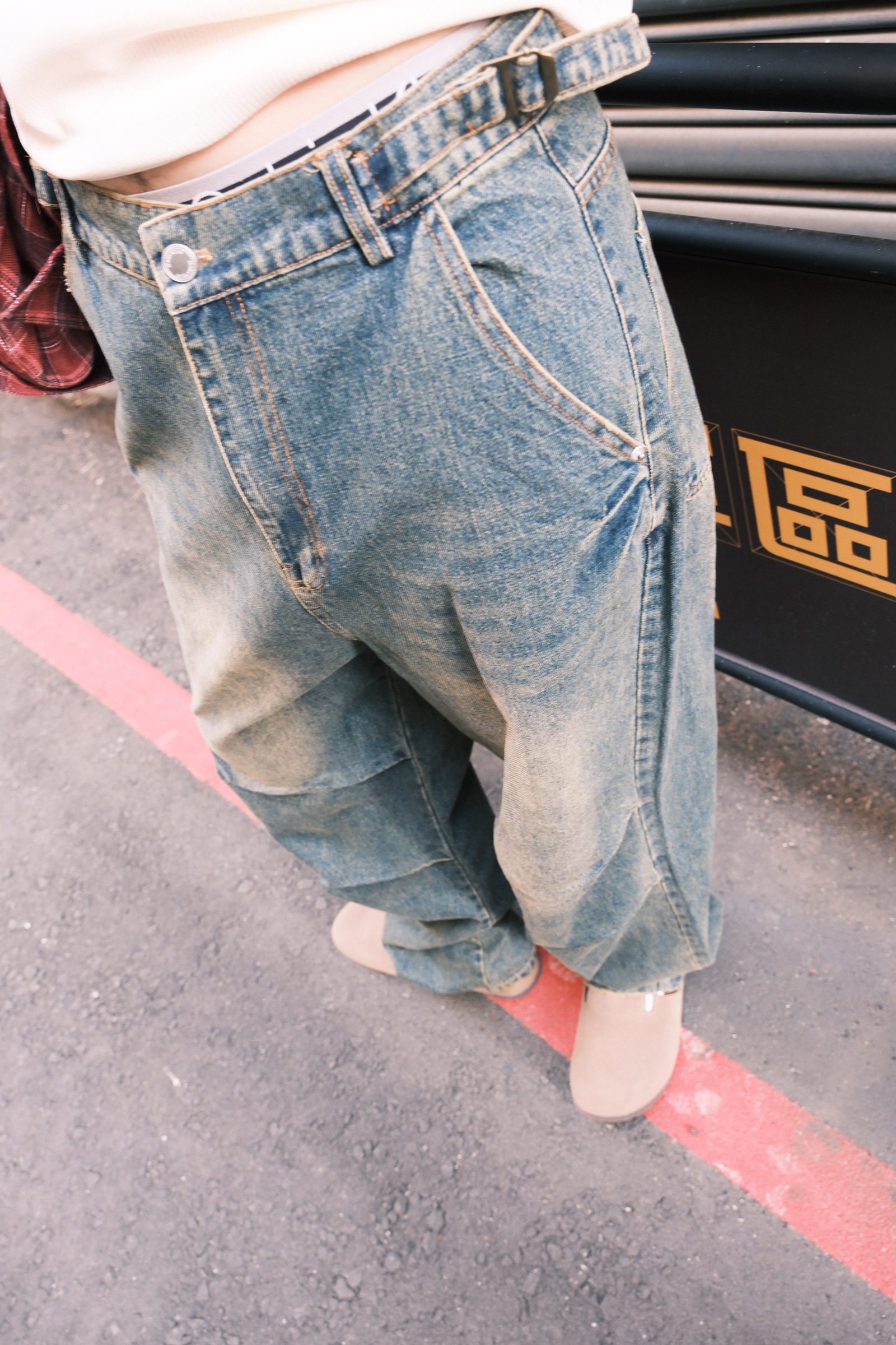 褲子復古刷色,膝蓋褶皺設計,整體氛圍感非常好
