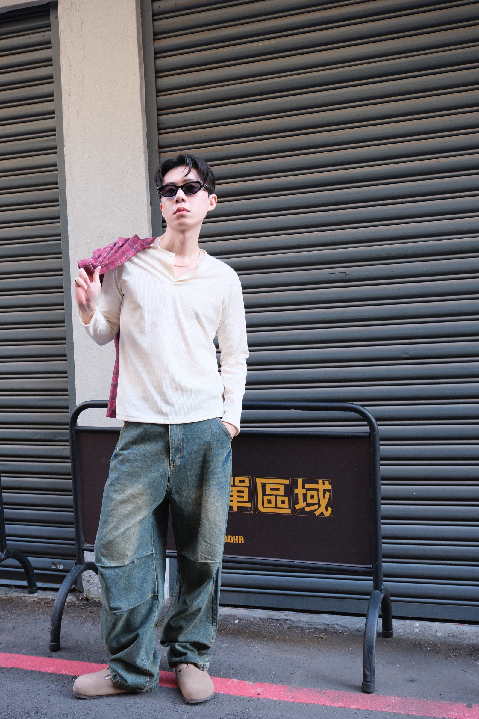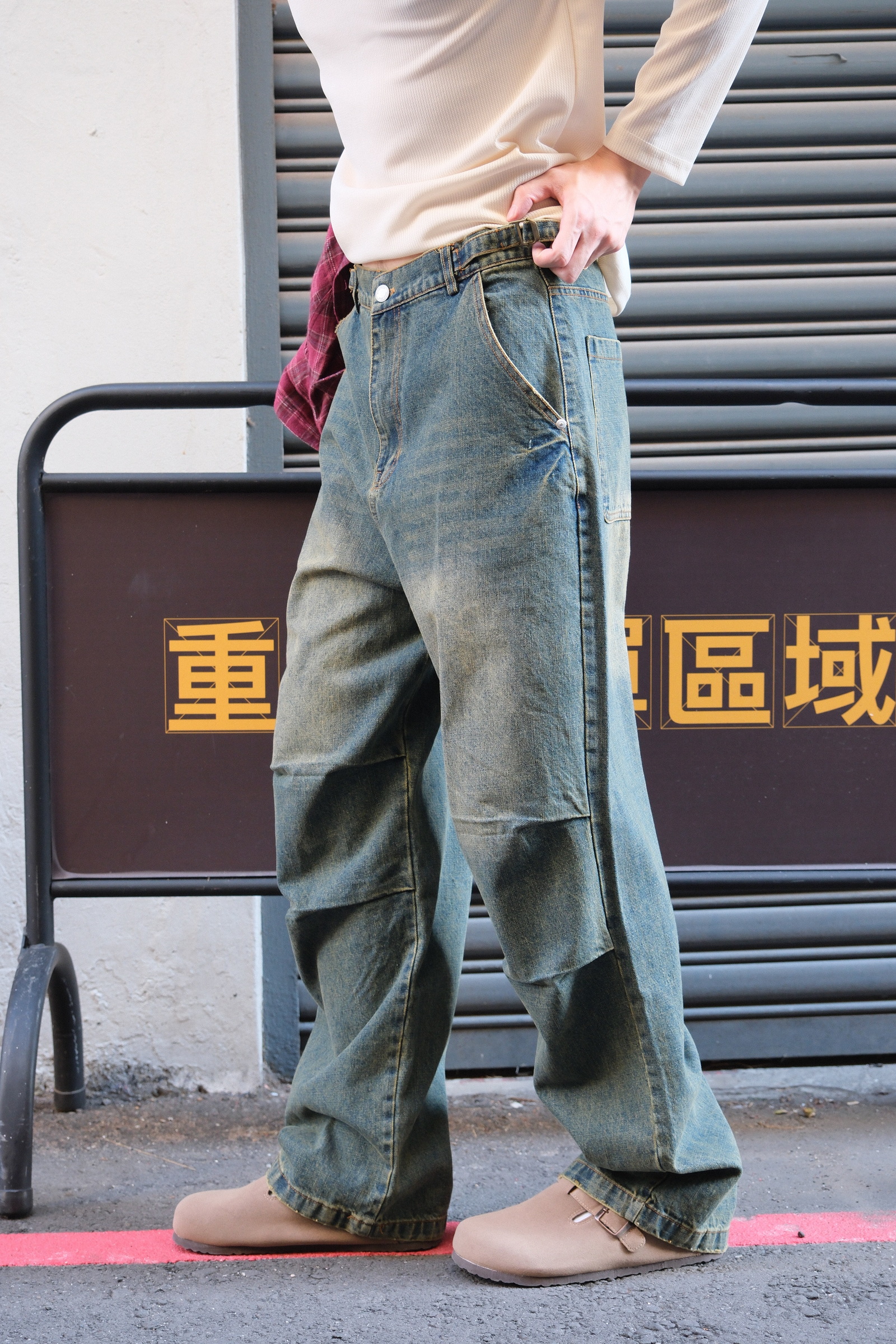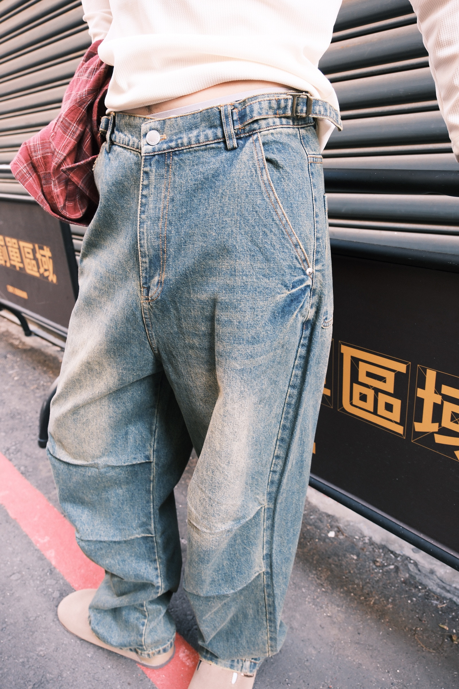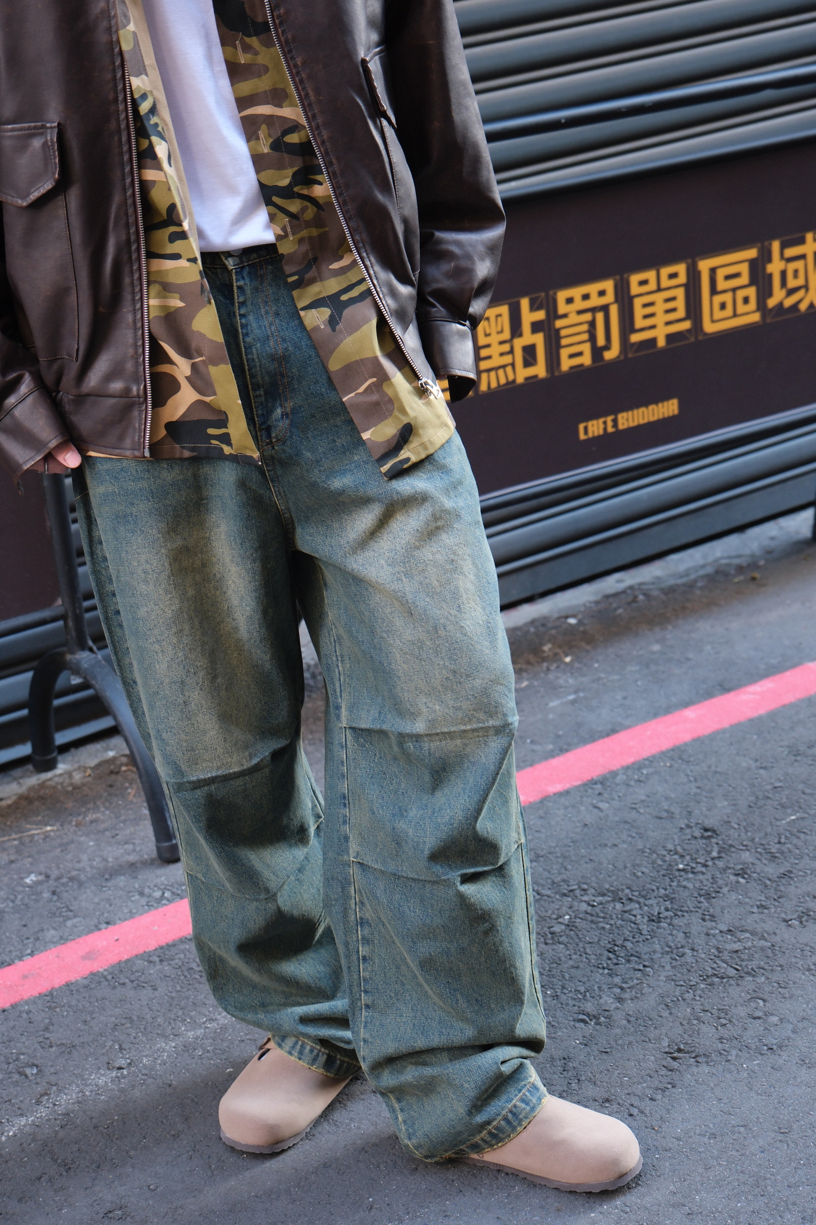褲子復古刷色,膝蓋褶皺設計,整體氛圍感非常好